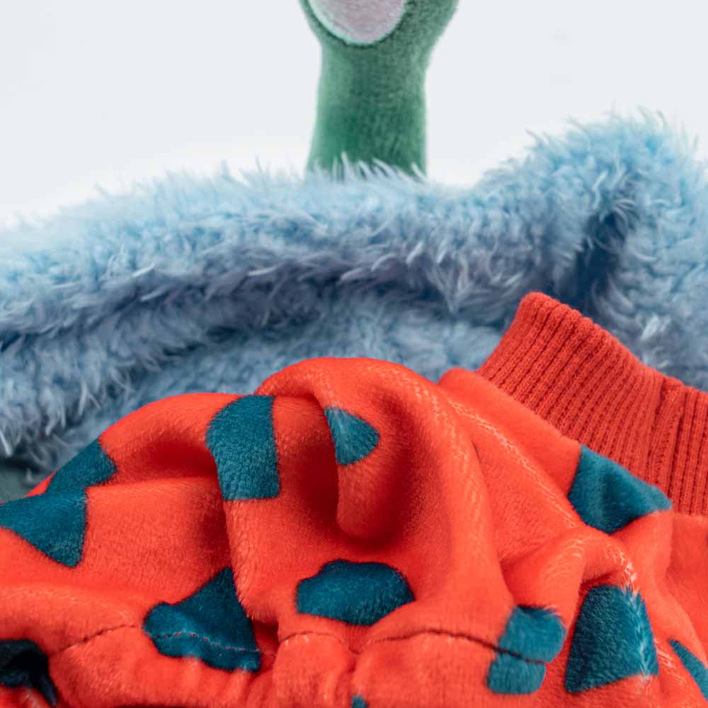 Funny red velvet dog monster costume detail: blue triangles, ribbed cuff, plush blue hood. Soft, cozy Halloween wear.