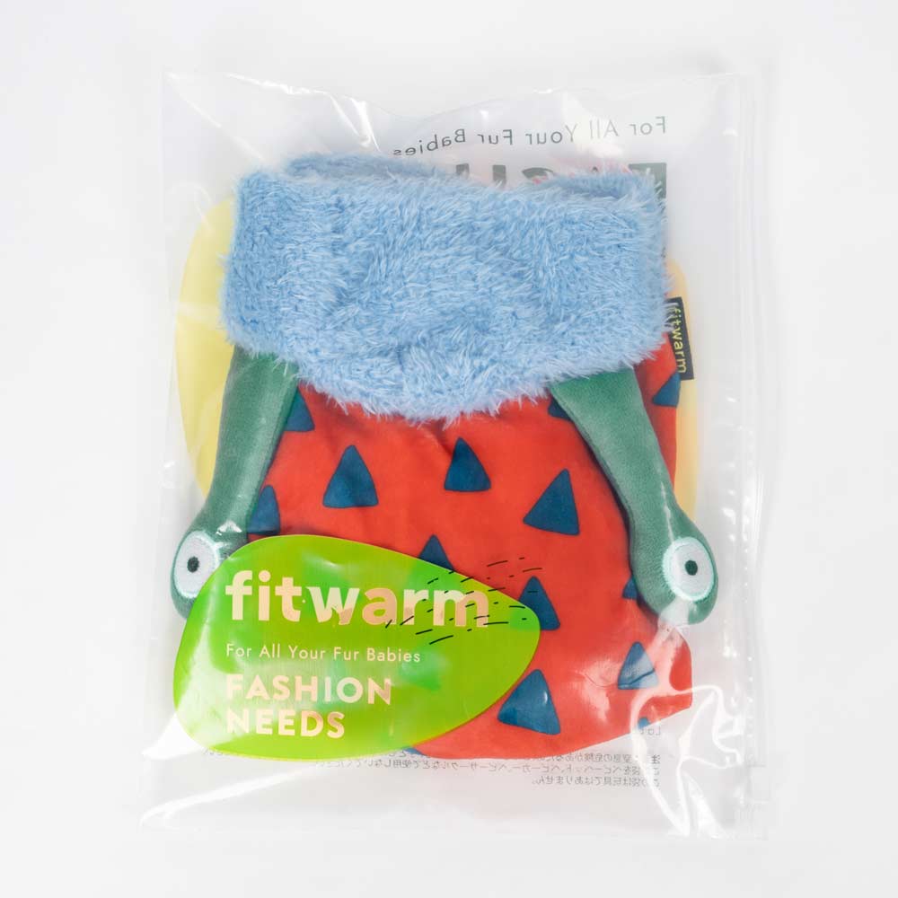 Packaged hilarious red velvet dog monster costume for Halloween, with blue triangles, fluffy blue hood, and playful eyes.