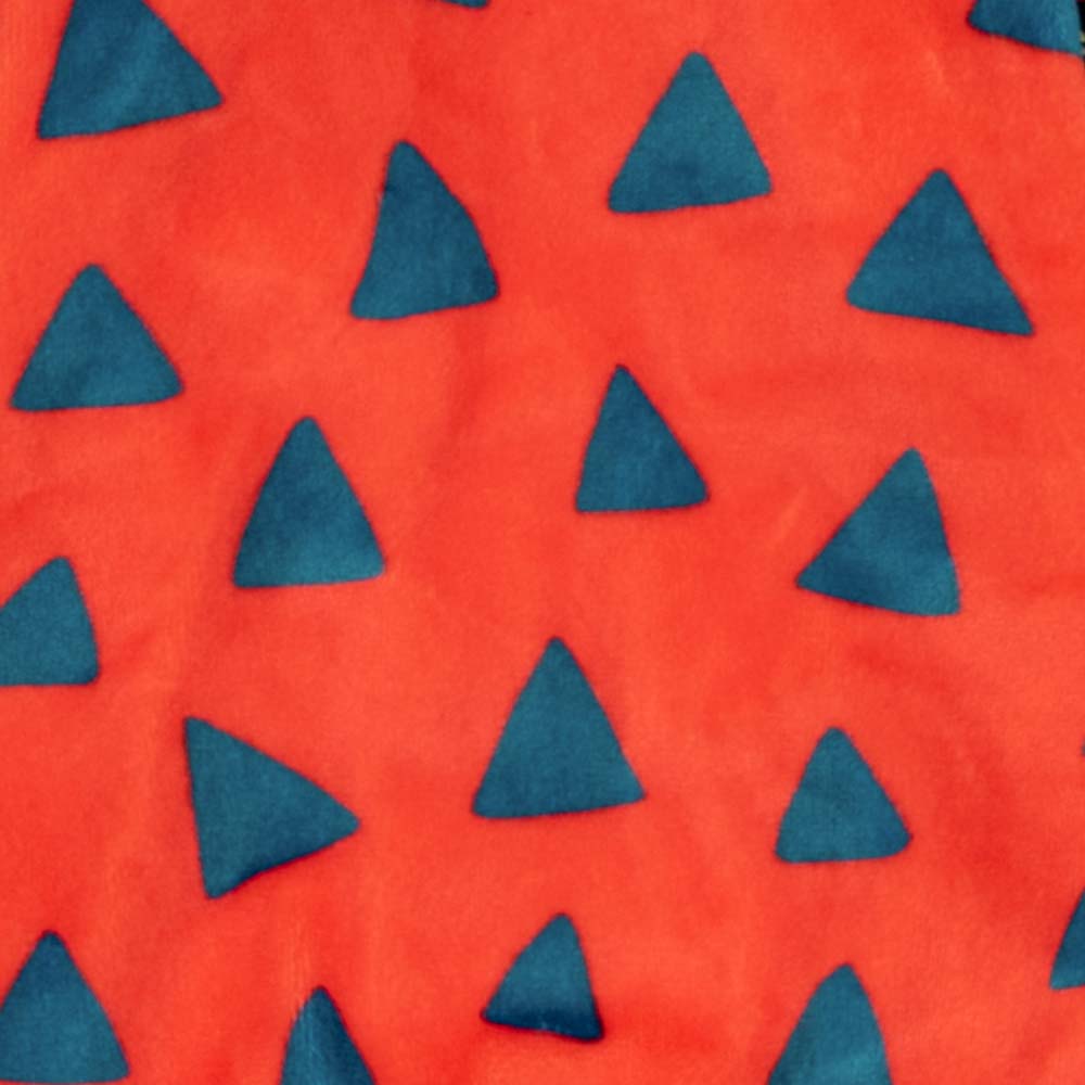 Red velvet fabric detail of a dog Halloween costume, featuring a bright blue triangle pattern.