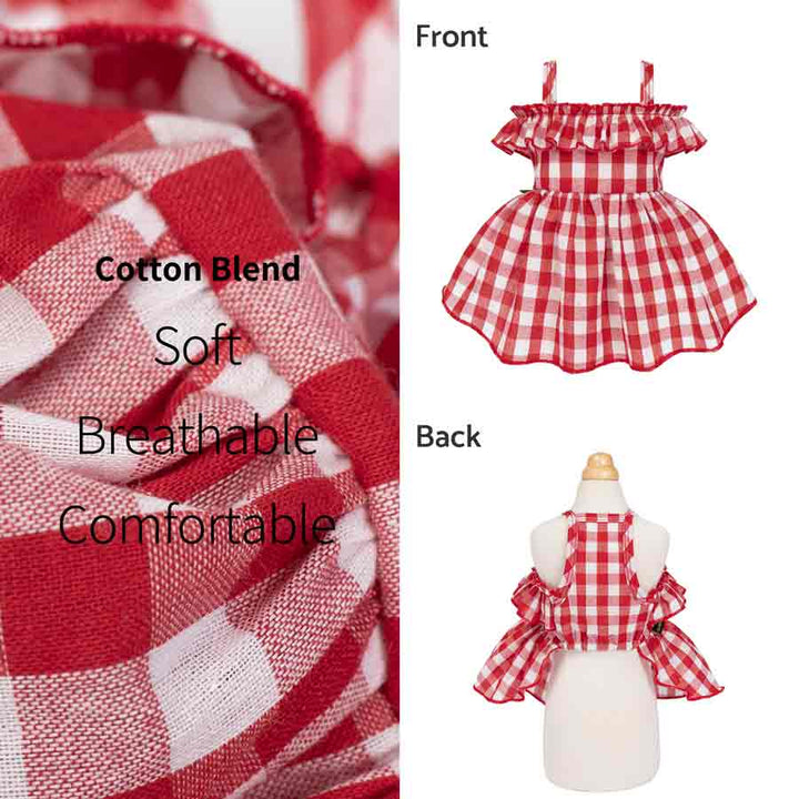Dress your pup in pure charm with this adorable dog holiday dress! Featuring a classic red and white gingham plaid pattern, this dog summer clothes piece is perfect for sunny days and special occasions. Ruffled details and charming straps add a touch of Bohemian style, making this dog dress a must-have for your furry friend's wardrobe. Whether you're enjoying a holiday gathering, a picnic in the park, or a fun summer outing, this dress is sure to keep your pup looking stylish and cute.