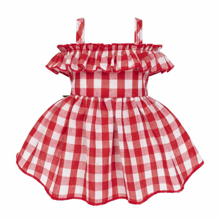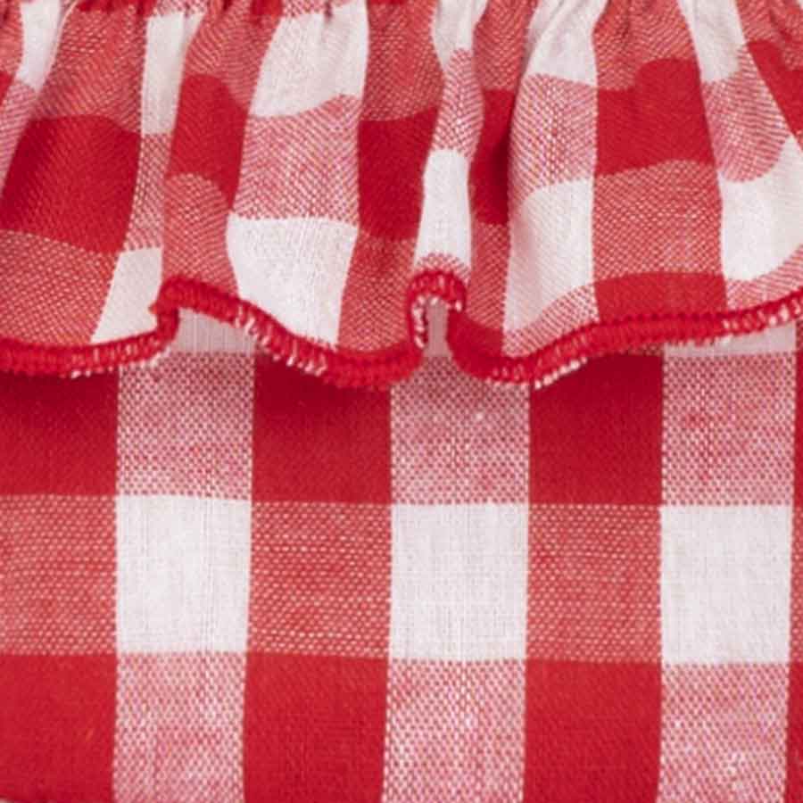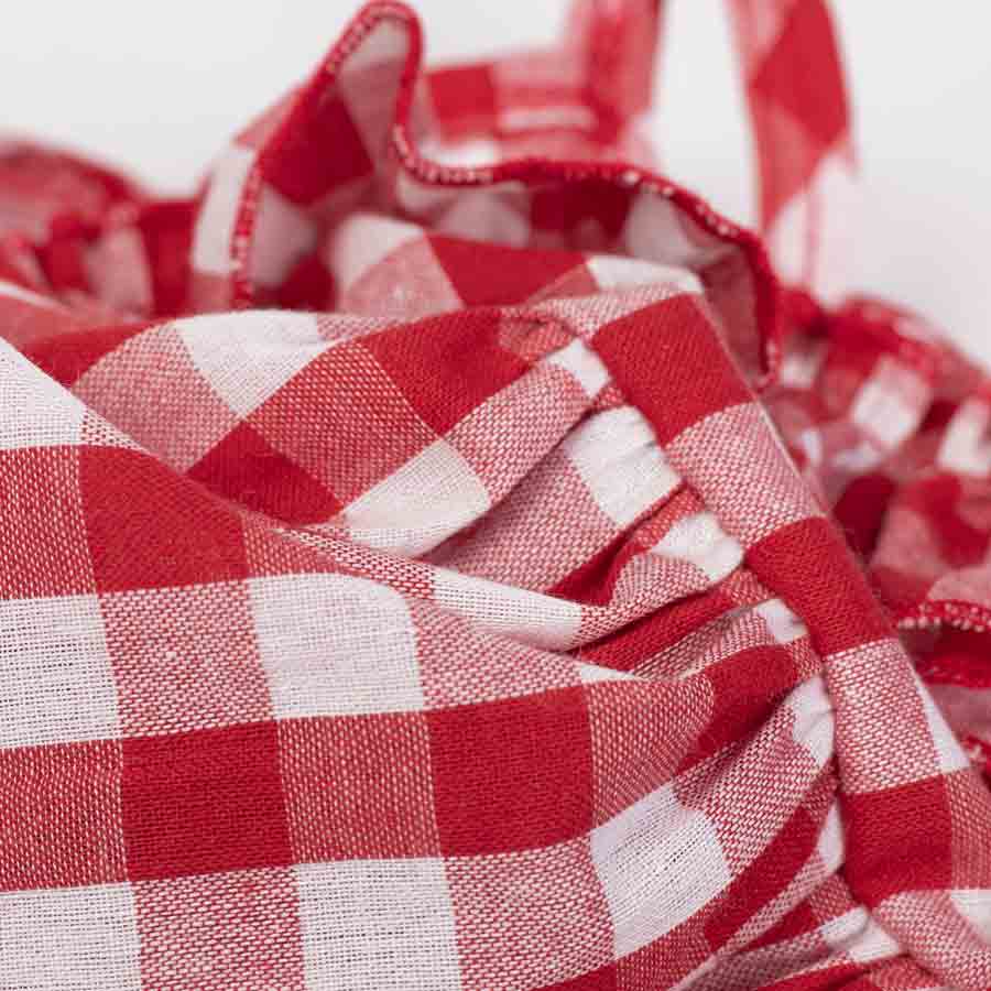 Red gingham plaid dog dress detail, featuring a cotton blend, ruffled edge, and a classic Bohemian summer style