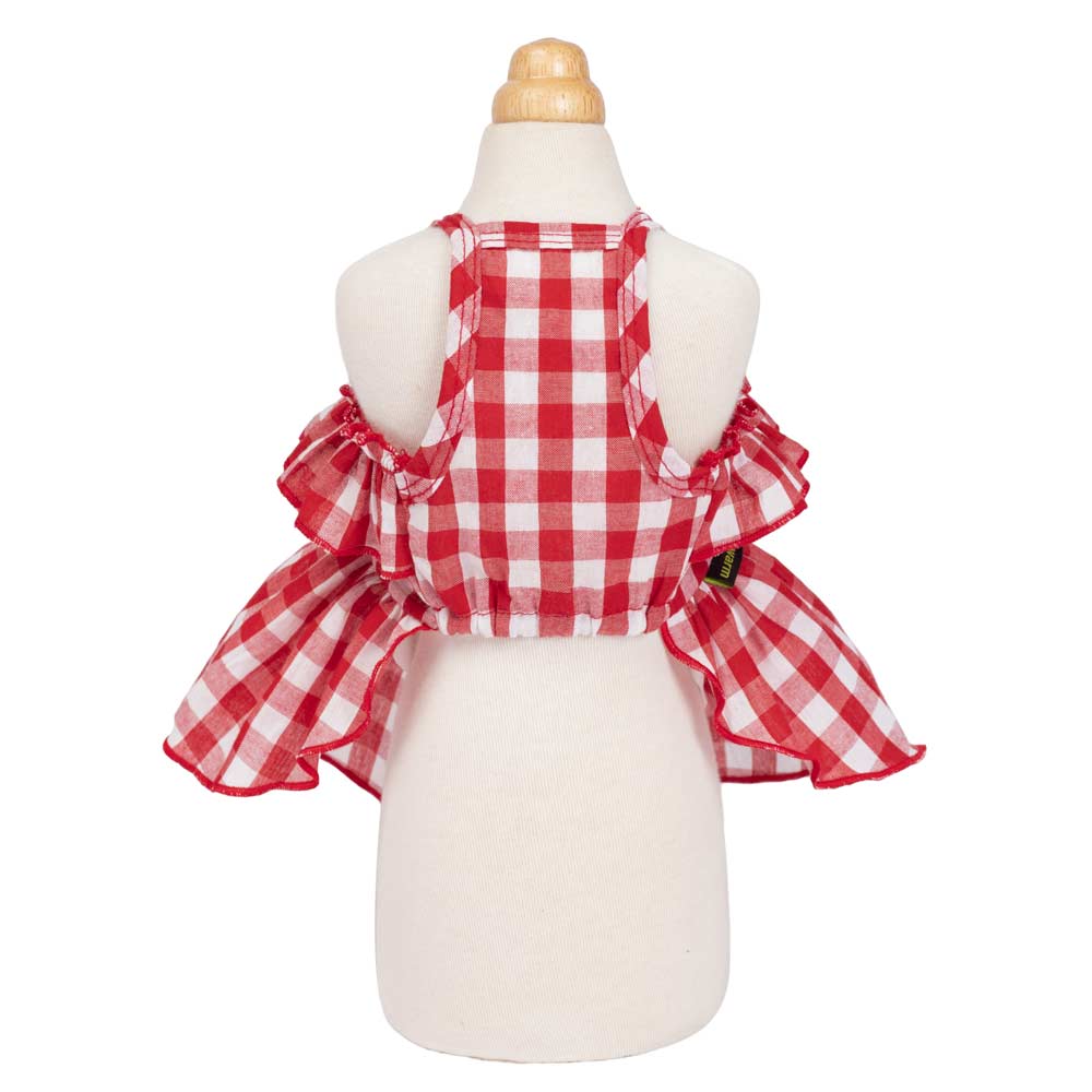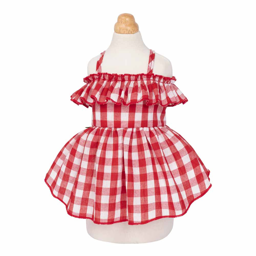 Red and white gingham plaid dog dress detail with ruffle and strap. Bohemian summer style for small dogs
