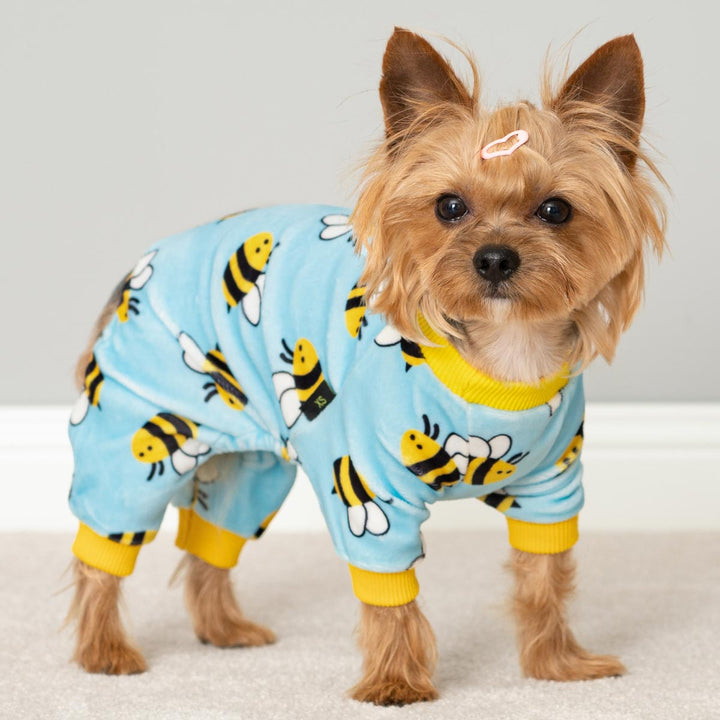 Blue bee dog pajamas, featuring lightweight, soft, breathable, comfortable, and stretchy fabric, and a fun bee print design