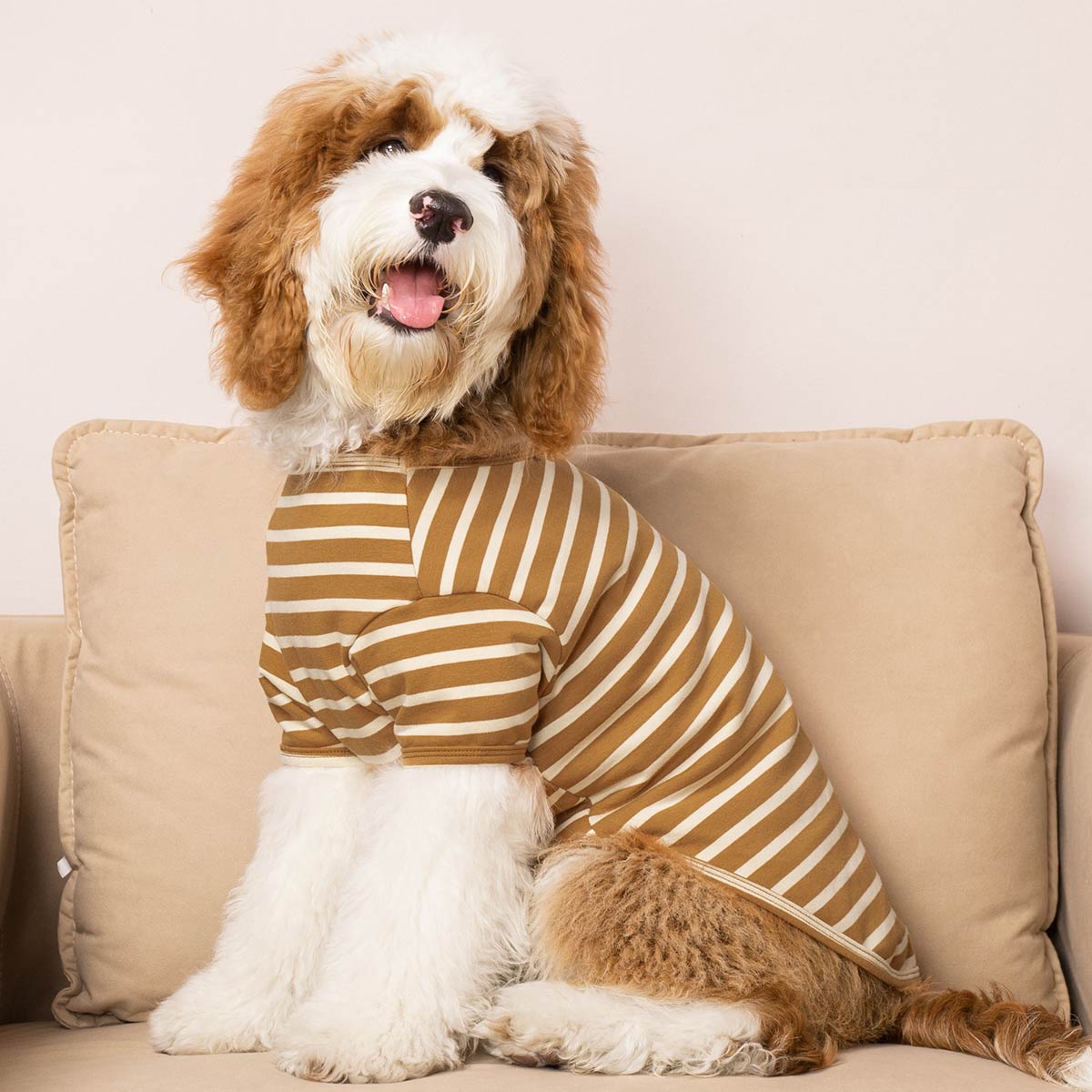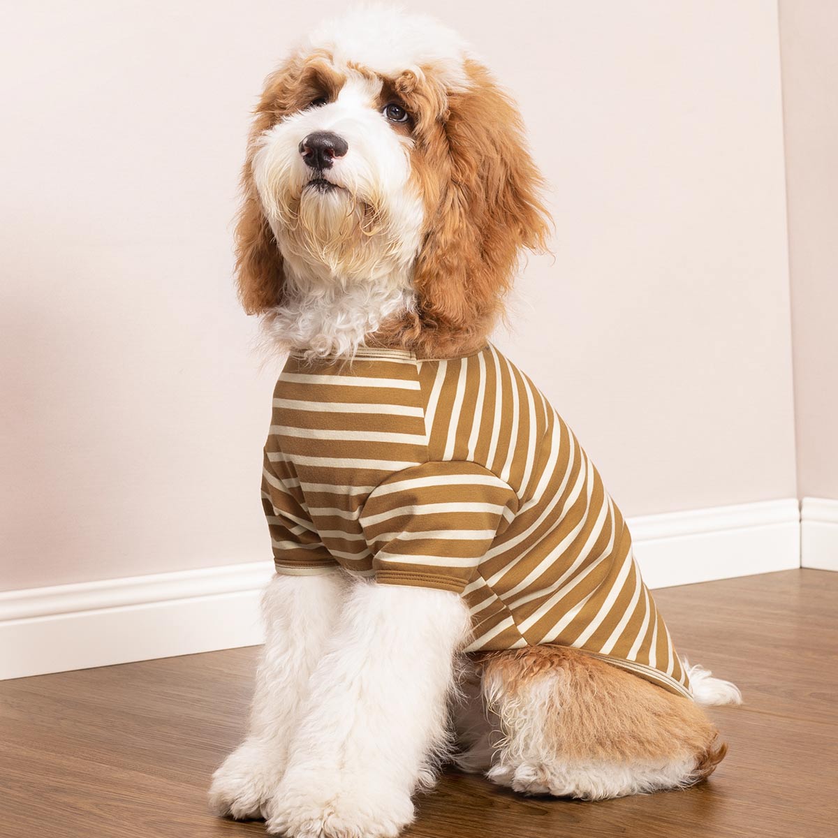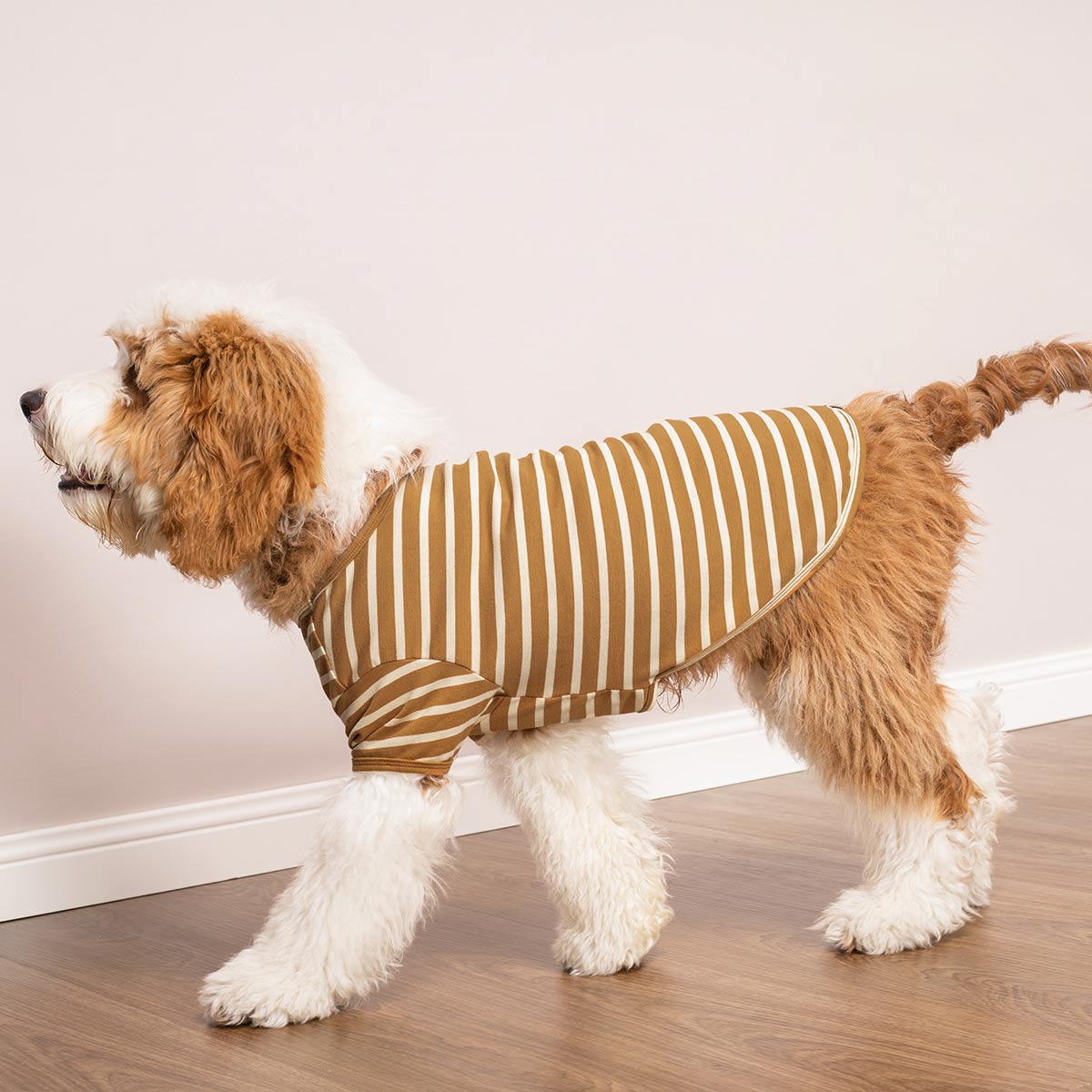 Dog wearing brown striped dog shirt, perfect for summer, soft, and breathable.