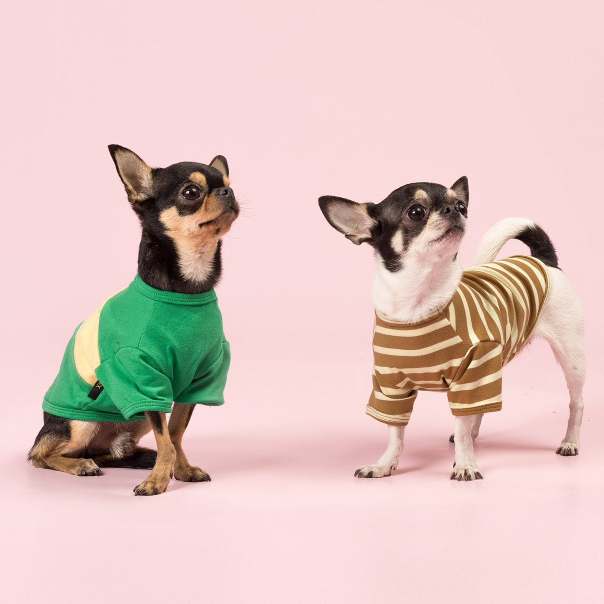 Chihuahua dogs in classic striped and color block dog shirts for summer. Breathable and soft for small dogs.