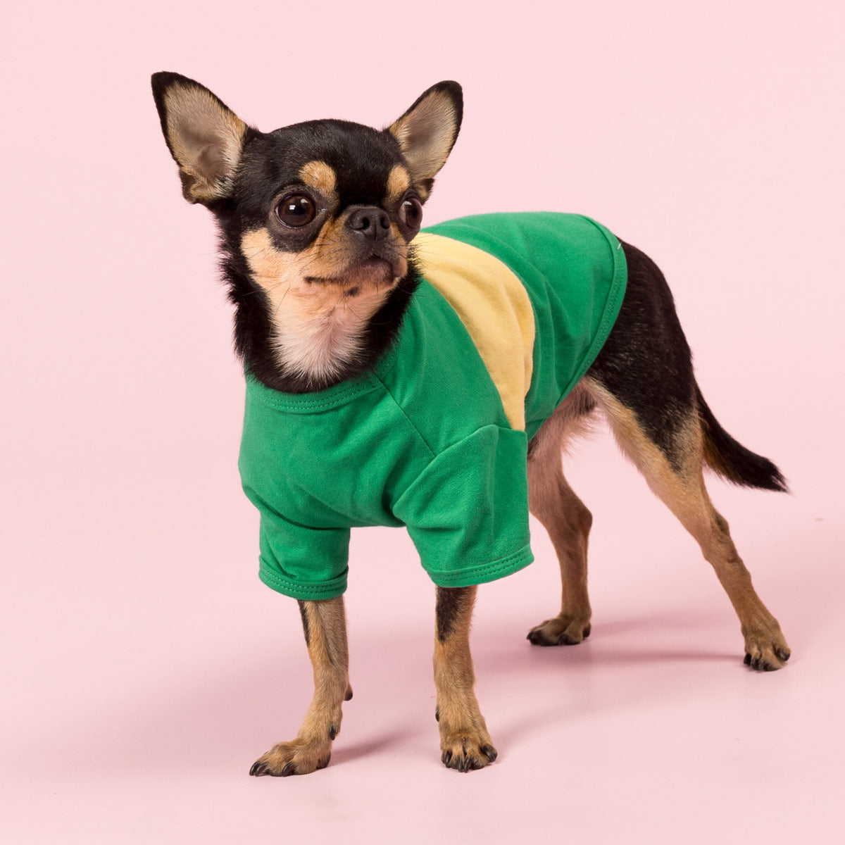Chihuahua dog in green and yellow color block shirt, perfect for small dogs. Breathable and soft for everyday wear.