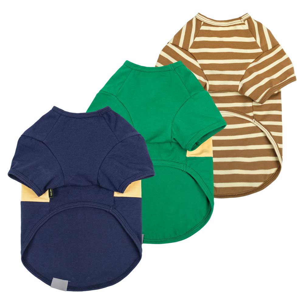 3 Pack of small dog shirts: striped, navy and color block. Breathable cotton tee for comfort and style from Fitwarm.