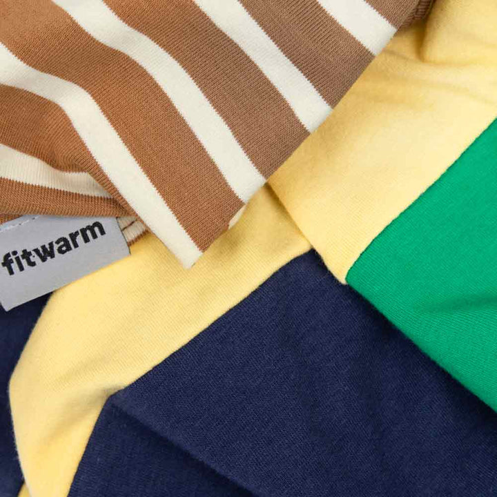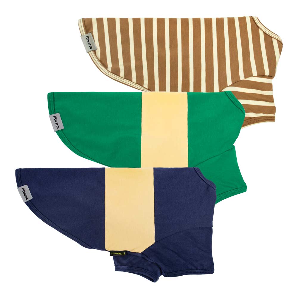 3 Pack of striped dog shirts in navy, green, and brown, Fitwarm brand. Made of soft, breathable fabric for small dogs