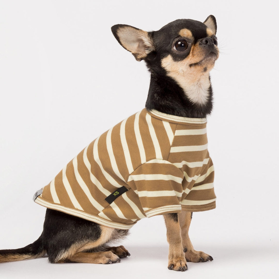 Dog in brown and white striped shirt. Soft, breathable cotton tee, perfect for small dogs' comfort and style.