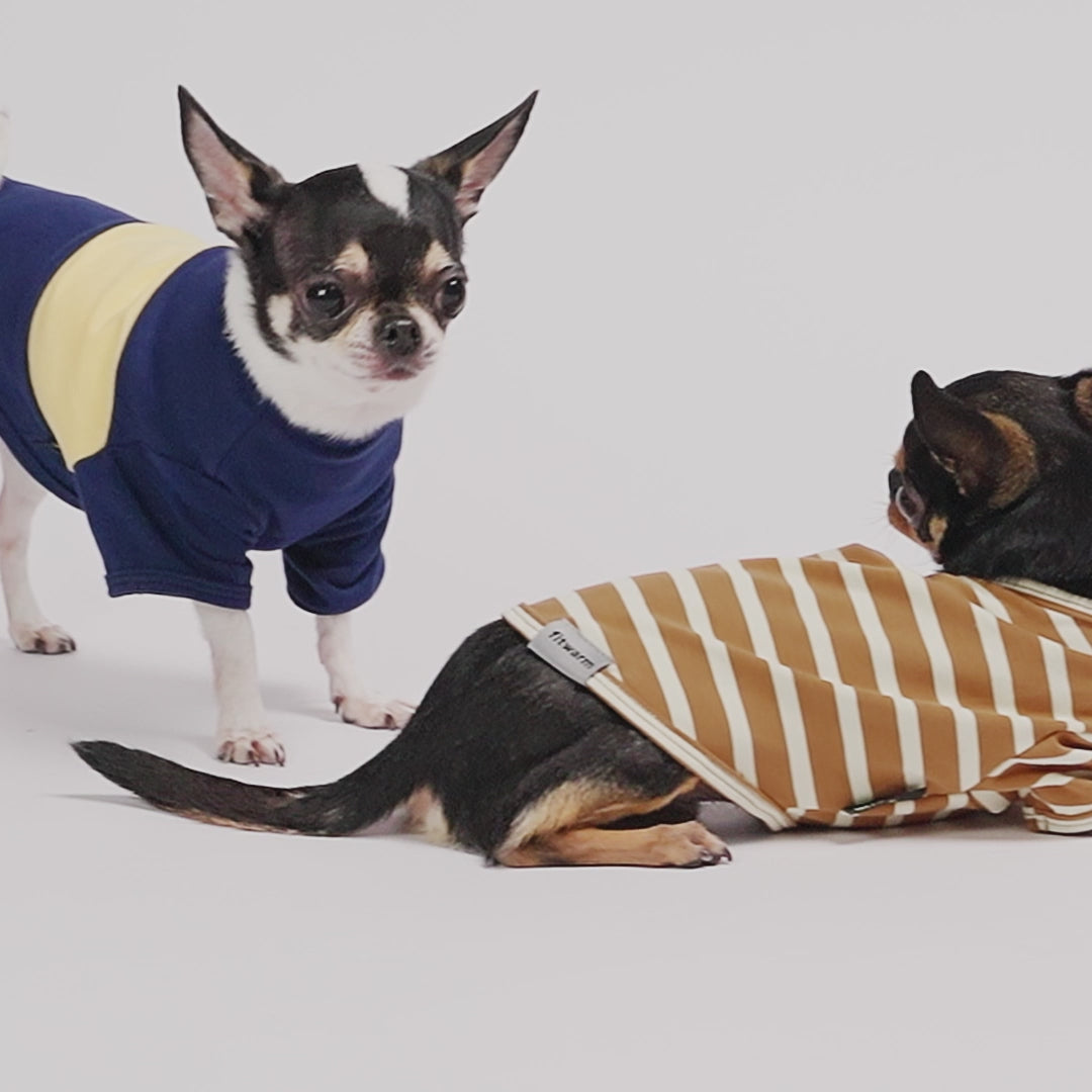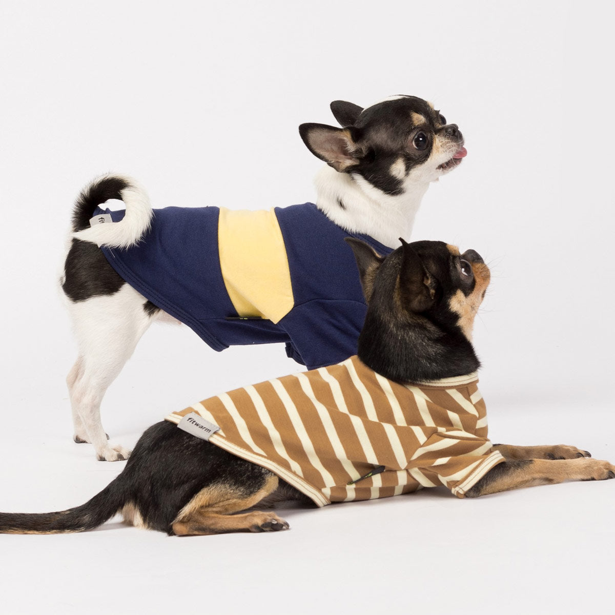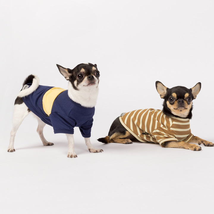 Two Chihuahuas in striped dog shirts: navy blue with yellow block and brown stripes, perfect for small dogs.