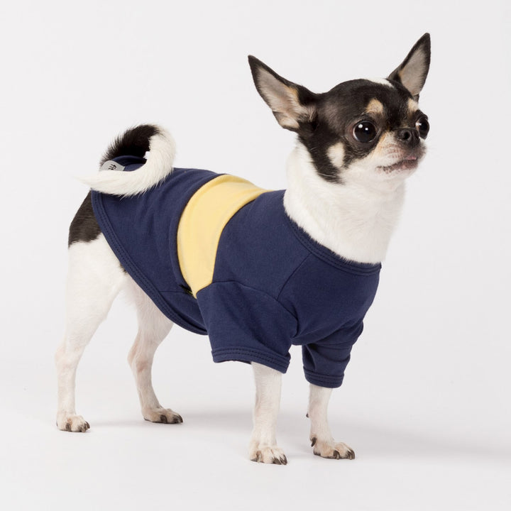 Chihuahua dog in navy blue shirt with yellow color block, soft and breathable, perfect for small dogs.