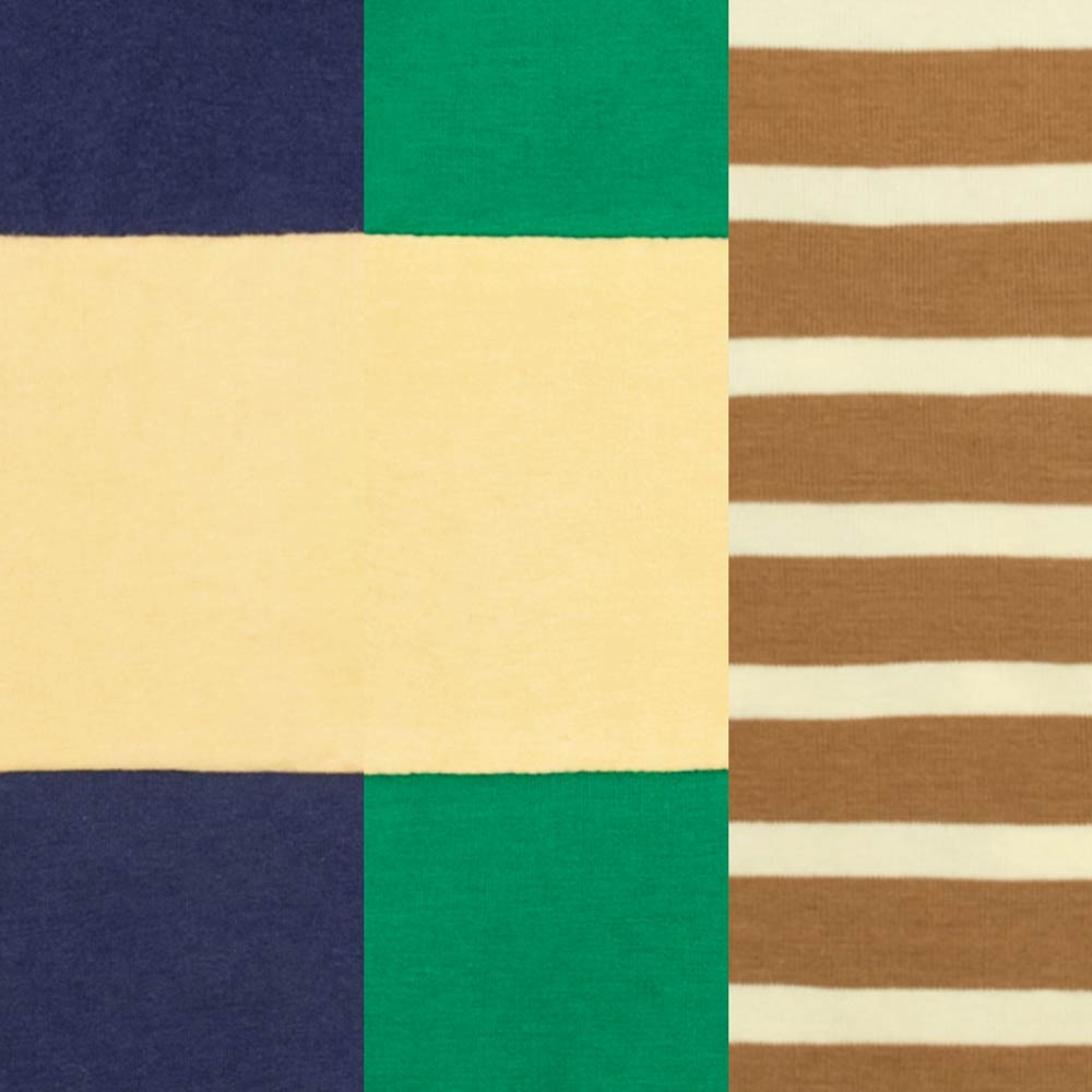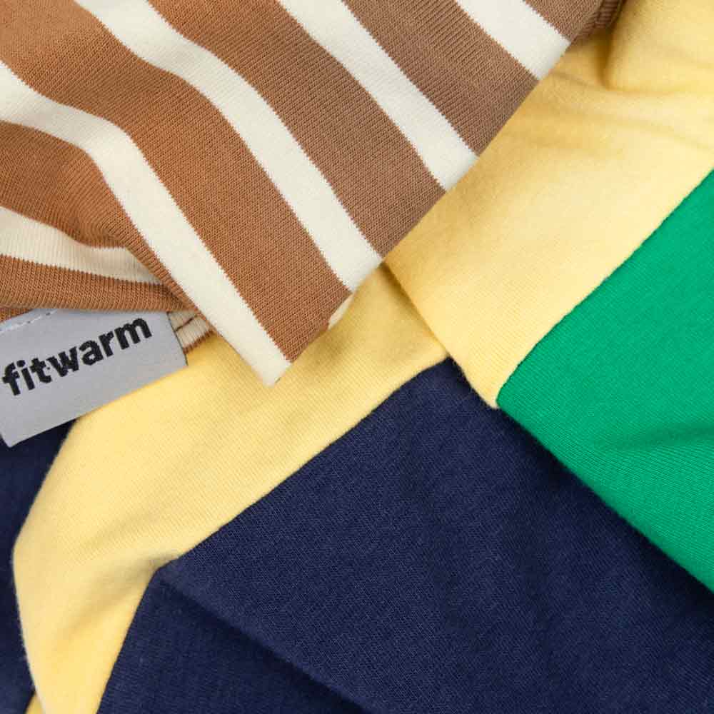 Fitwarm small dog shirt fabric swatches: navy, green, tan color block, brown striped. Breathable cotton blend.