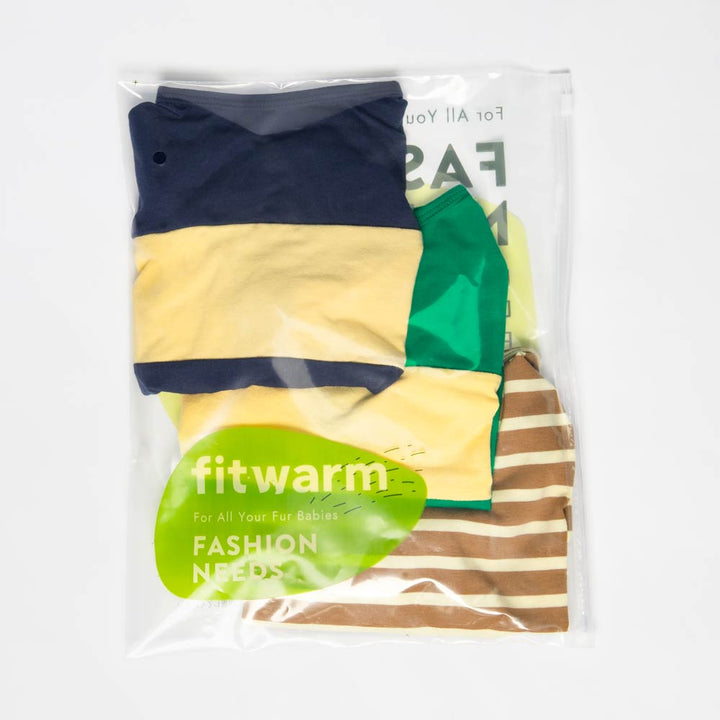 Fitwarm 3-pack dog shirts in a clear package: classic striped and color block designs, perfect for small dogs.