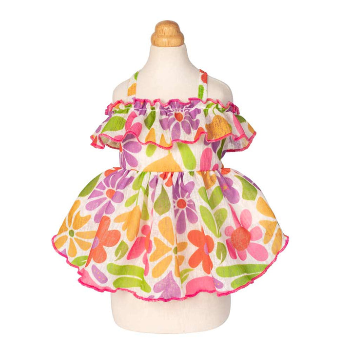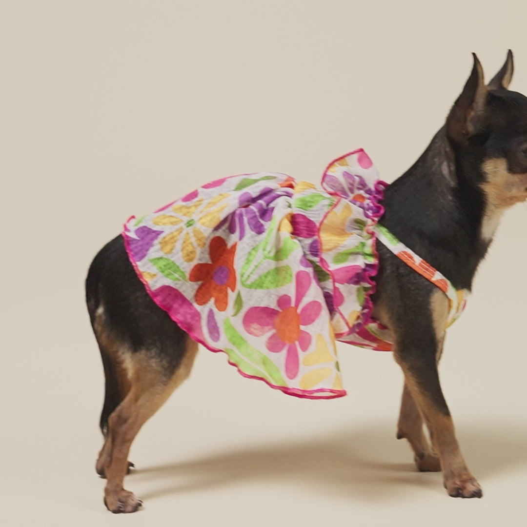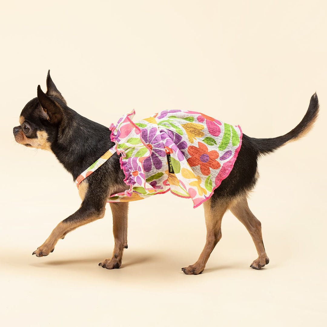 Colorful floral dog dress with ruffles, ideal for Easter, for small dogs. Features vibrant flower prints.