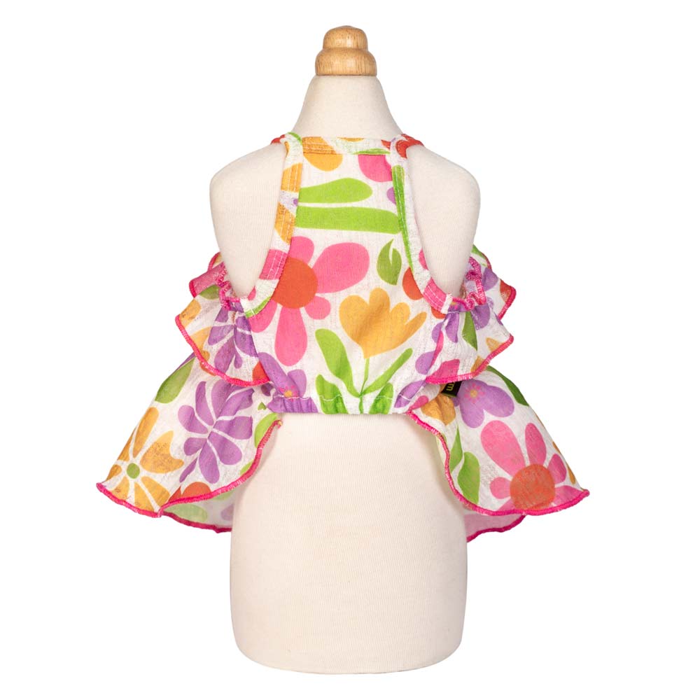 Colorful floral dog dress with ruffles, perfect for spring or Easter. Featuring vibrant flower prints and comfortable design