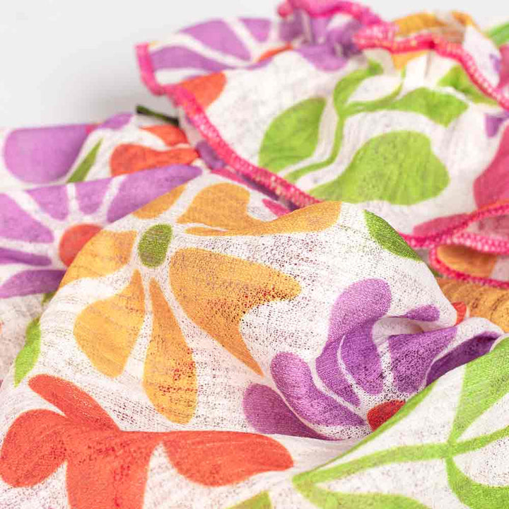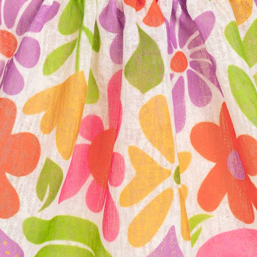 Close-up colorful floral dog dress fabric with flower prints and ruffle details, perfect for Easter.