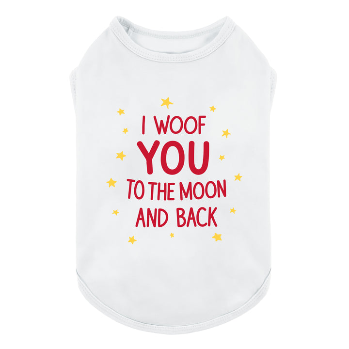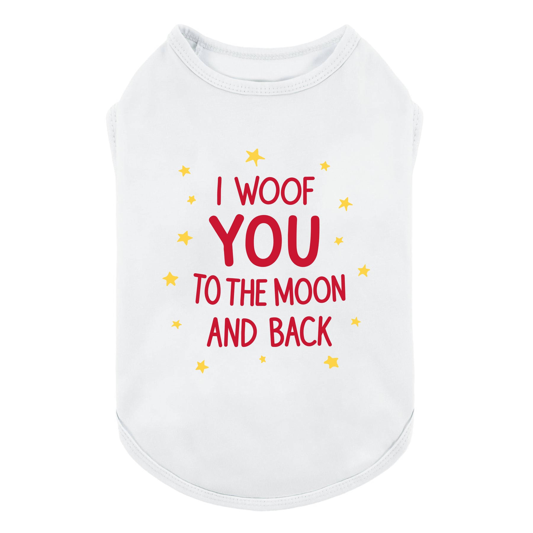 White dog shirt with red text "I Woof You to the Moon and Back" and yellow stars.