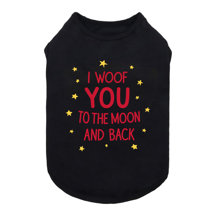 Black dog shirt with red text "I WOOF YOU TO THE MOON AND BACK" and yellow stars.