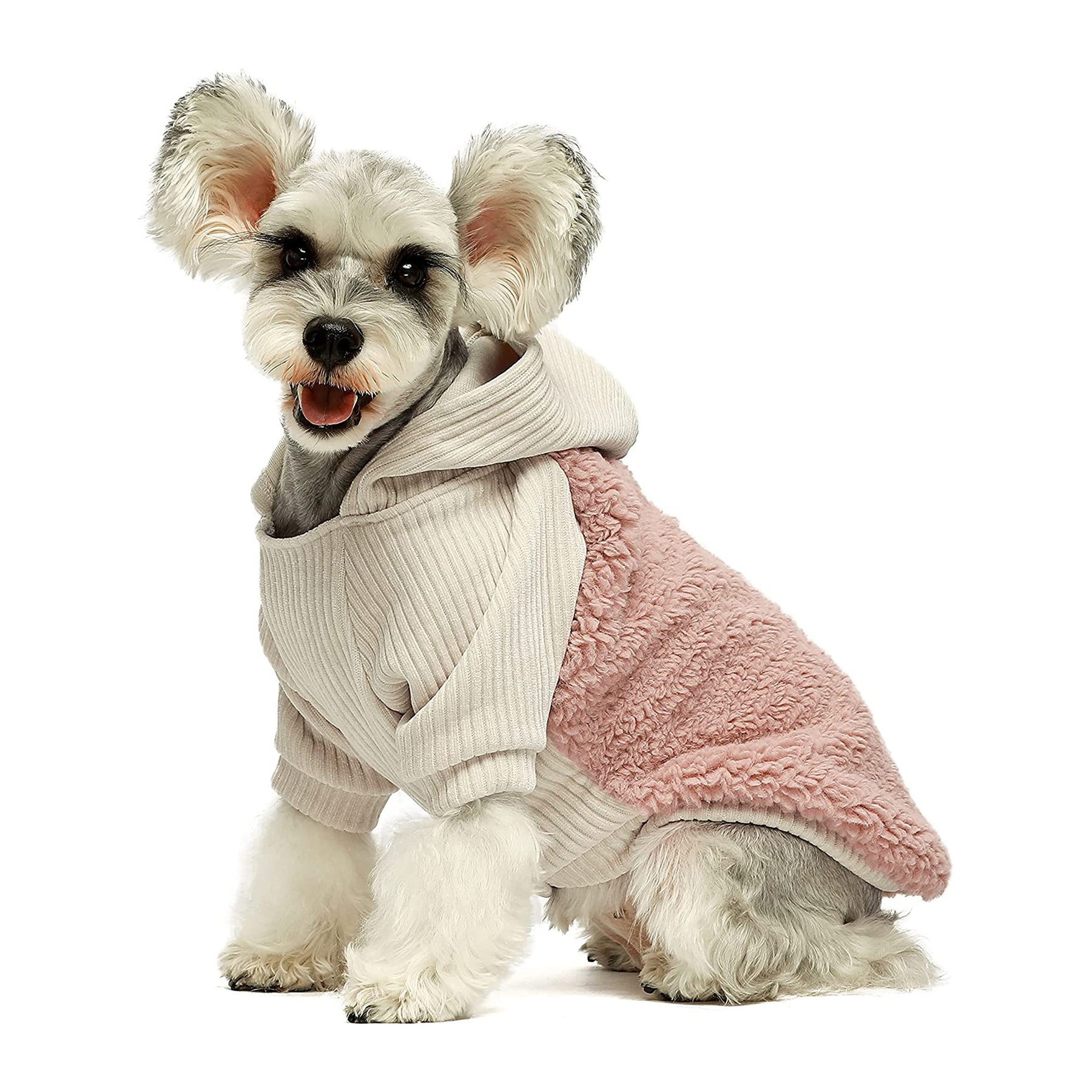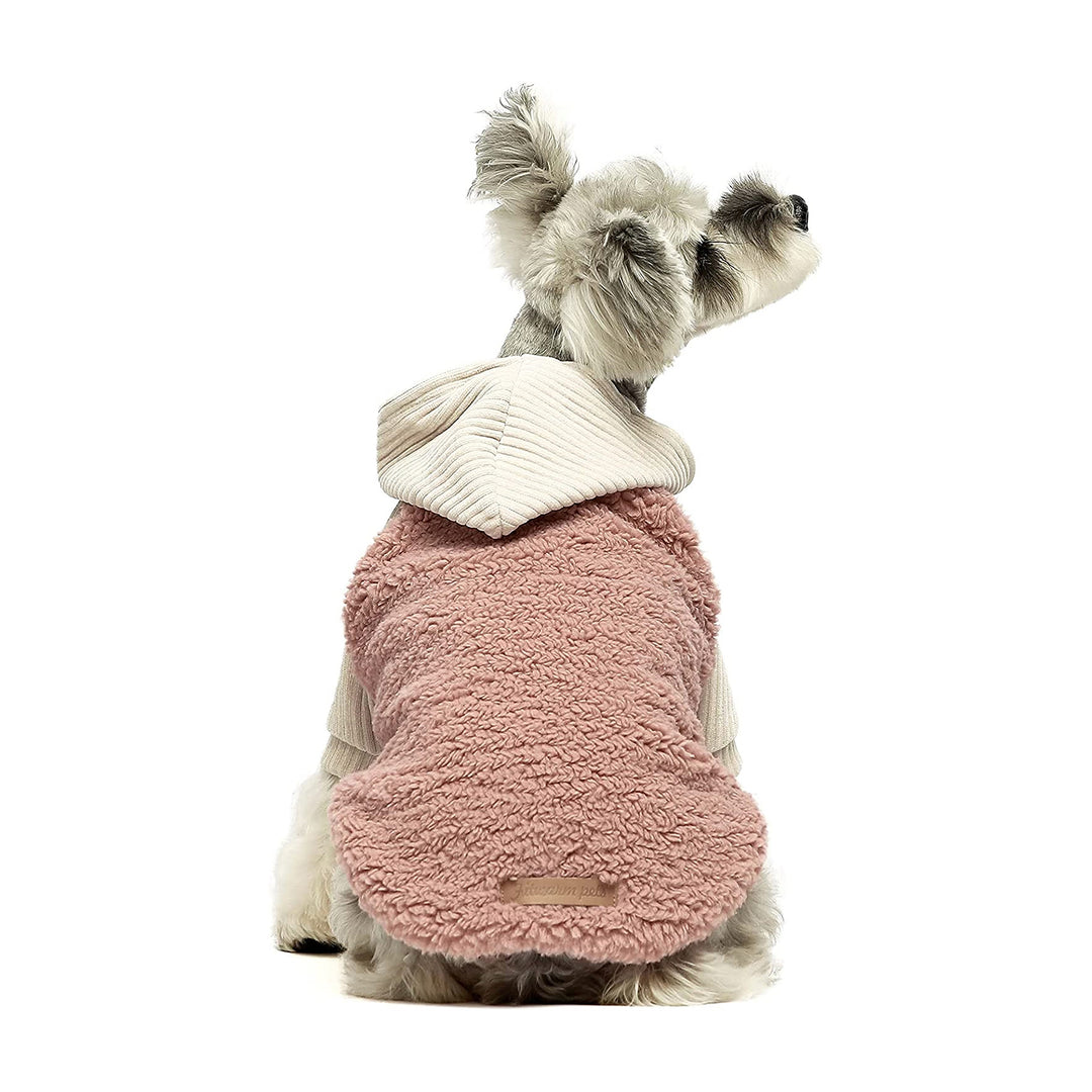 Dog wearing a pink velvet thermal hoodie with fleece sleeves and hood from Fitwarm