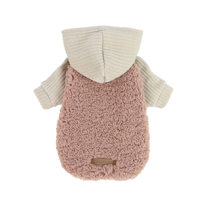 Pink Velvet Thermal Hoodie for Dogs. White dog wearing cream ribbed hoodie and pink fleece.