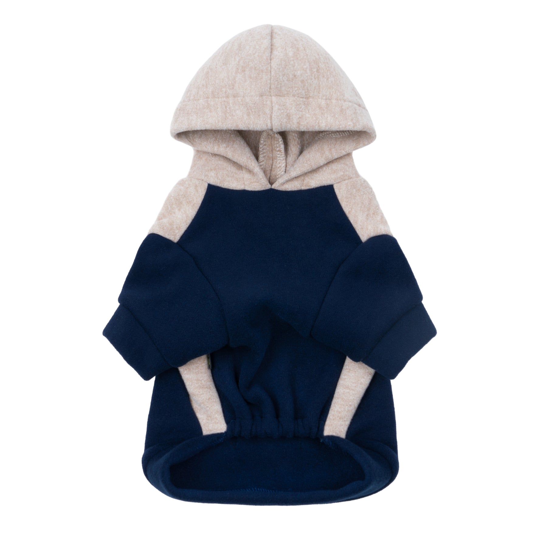 Navy dog hoodie featuring colorblock design with beige hood and sleeves.