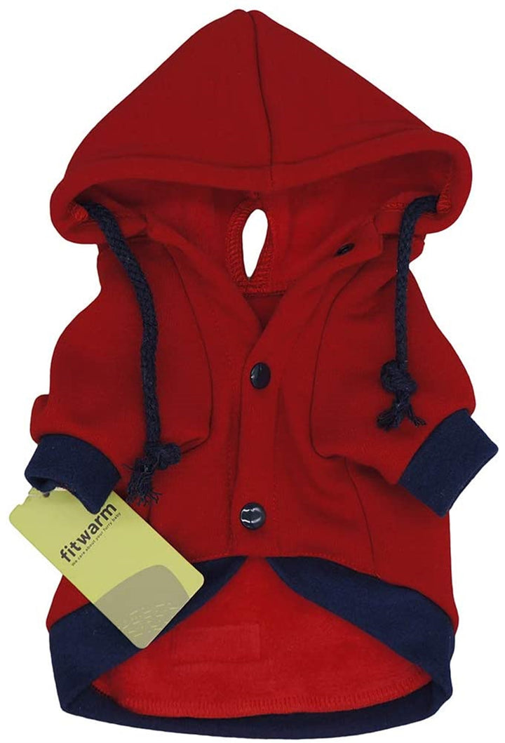 Fitwarm dog hoodie with drawstring, red with navy trim, for small dogs.