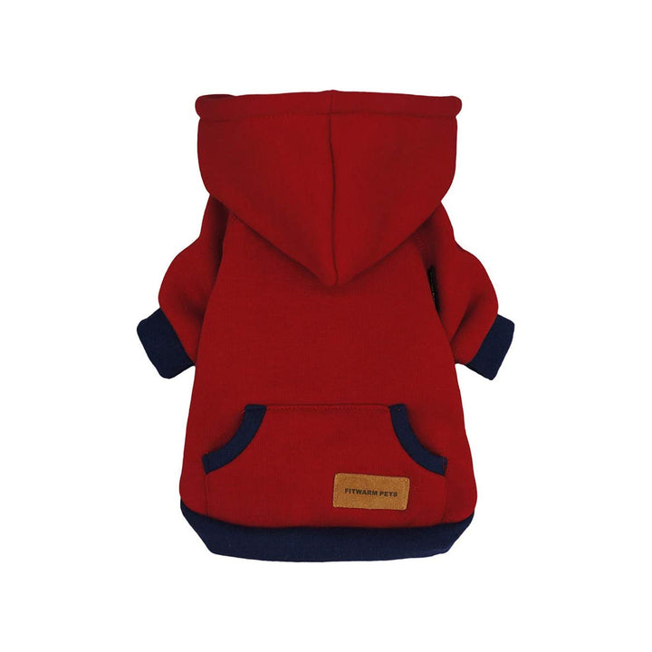 Red dog hoodie with navy trim by Fitwarm Pets, soft and comfortable apparel for your dog, perfect for everyday wear.