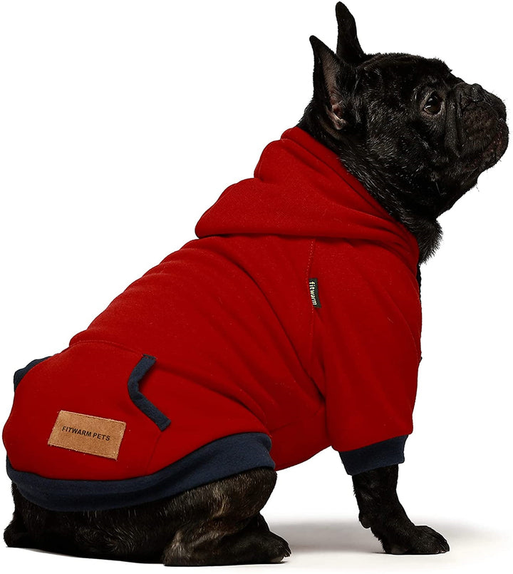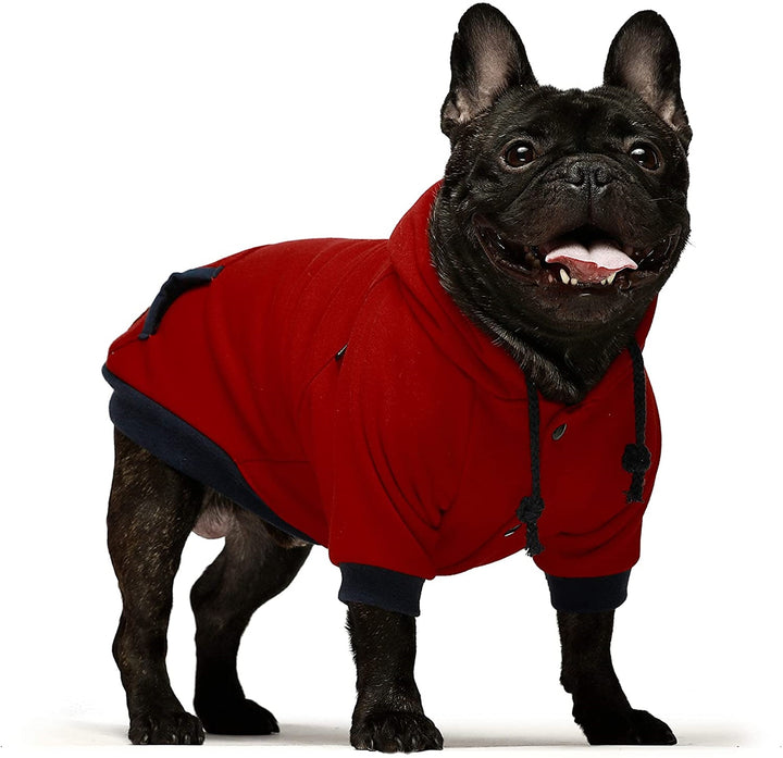 Fitwarm drawstring hoodie for dogs. Red hoodie with navy trim, comfortable and stylish dog apparel.