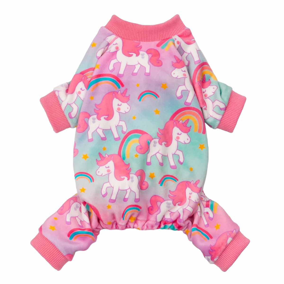 Adorable dog pajamas with pink unicorn prints, rainbows, and Fitwarm label on the side.