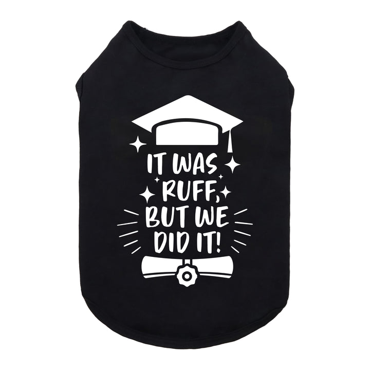 Black dog shirt with white text "It was ruff, but we did it!" and a graduation cap and scroll.