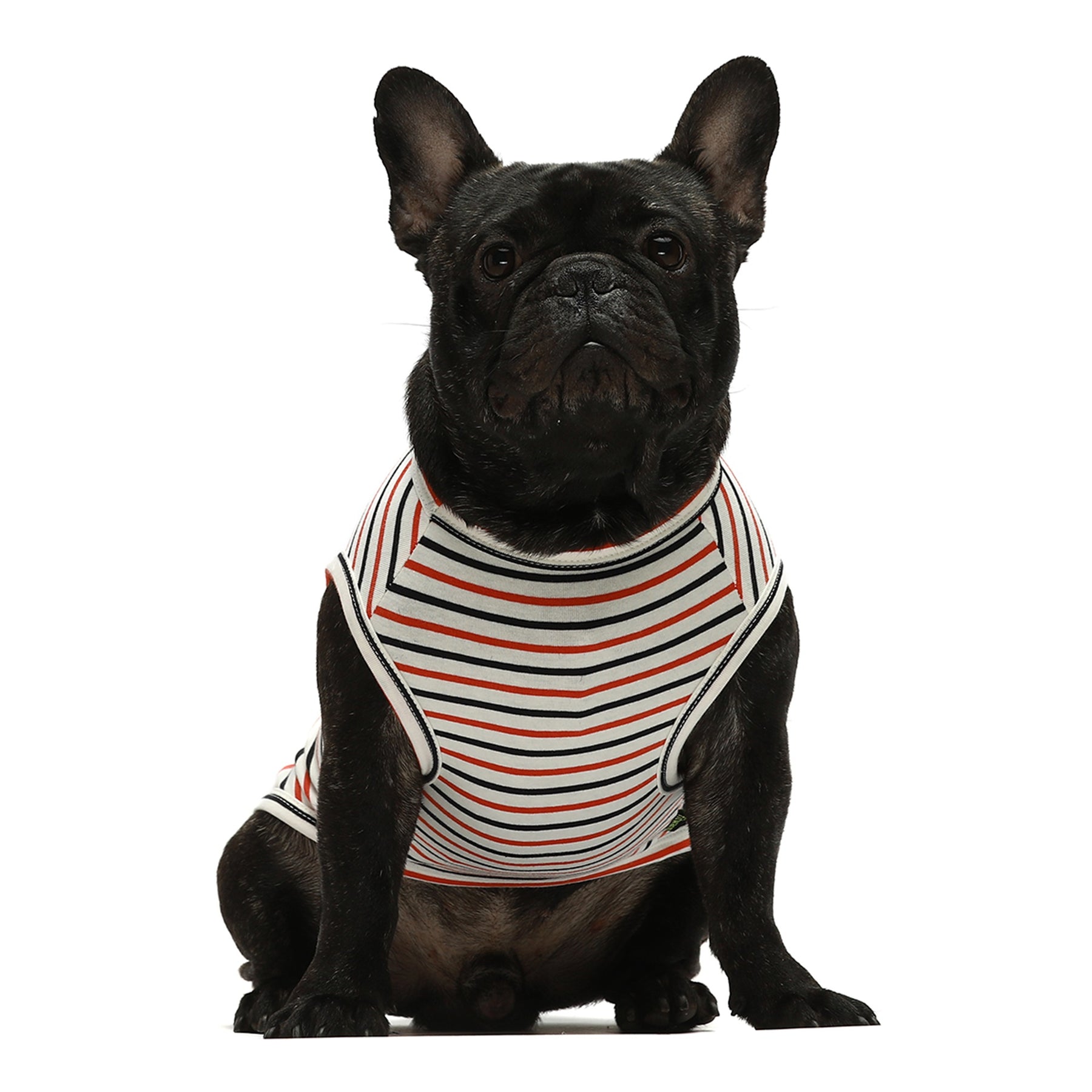 French Bulldog in striped cotton shirt, red, black, and white stripes
