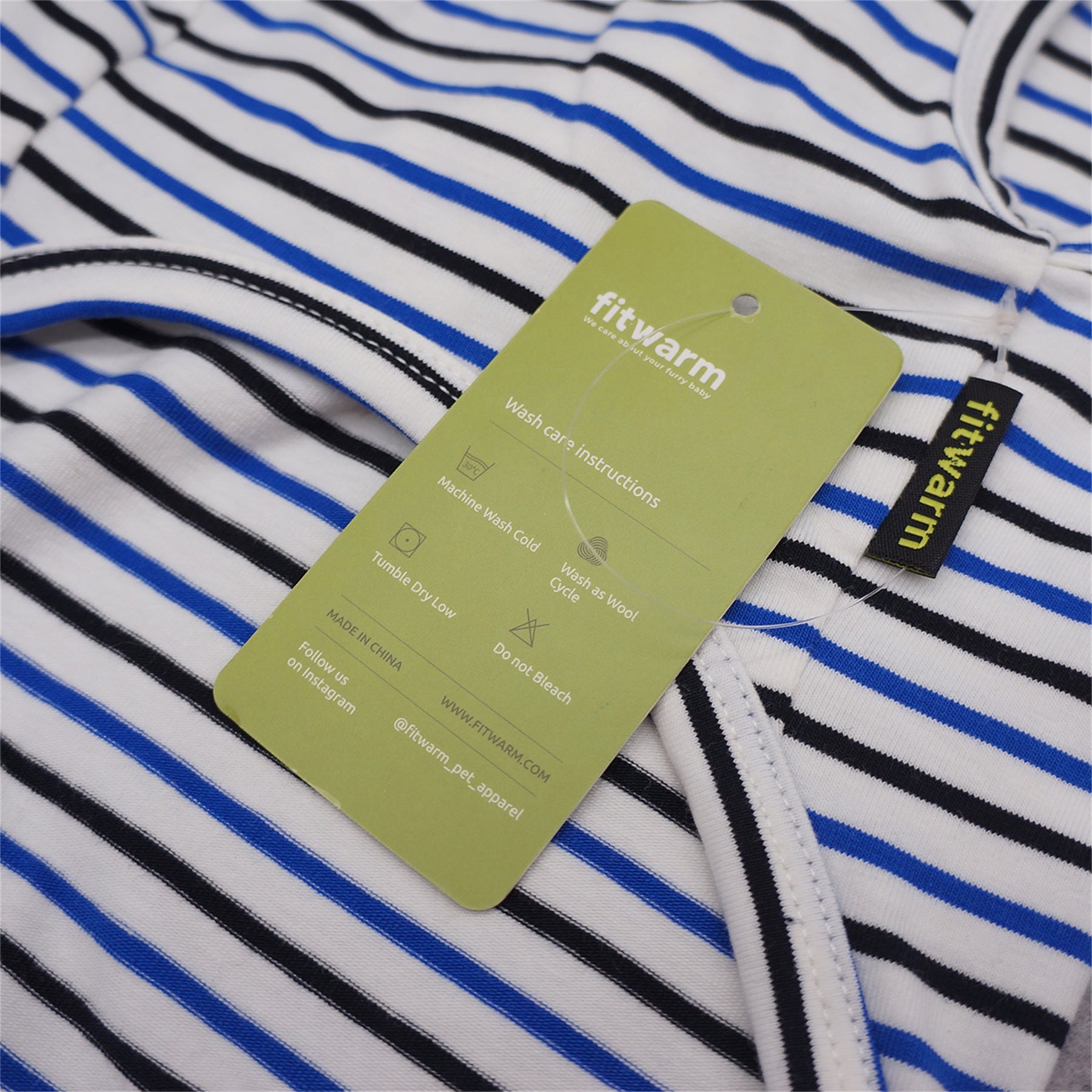 Striped dog shirt from Fitwarm, blue, black, and white stripes, with wash care tag. Cotton fabric.