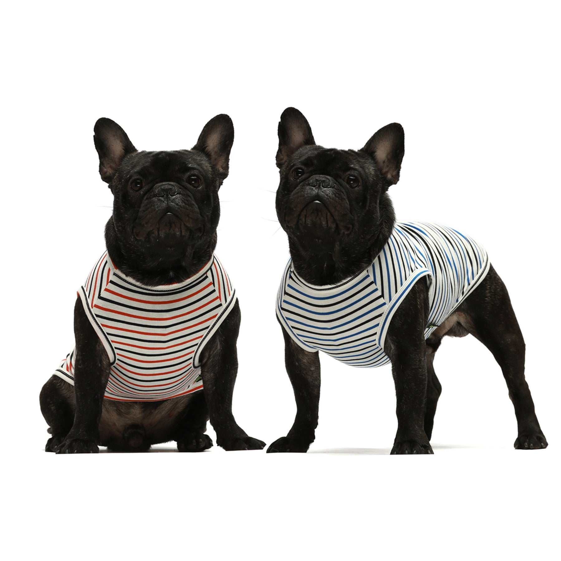 2-Pack striped dog shirts in red/black/white and blue/black/white for French Bulldogs, cotton