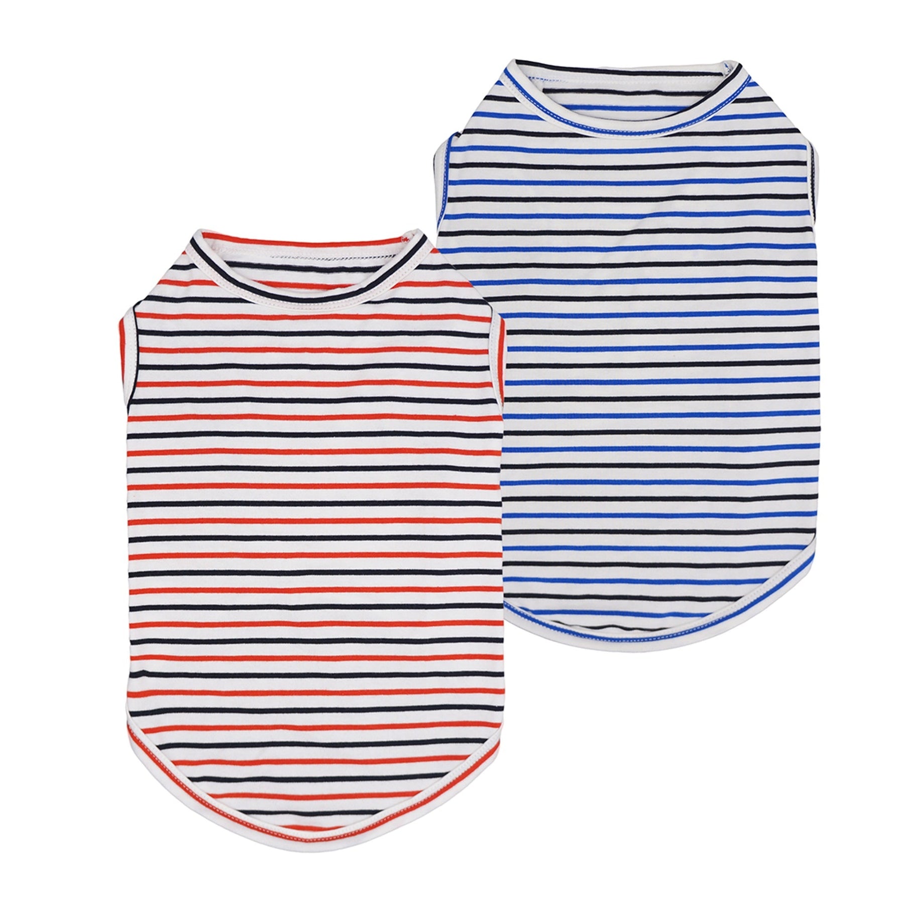 2-pack striped dog shirts in red/black/white and blue/black/white stripes, comfortable cotton