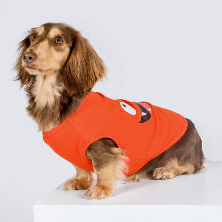 Orange three-eyed monster dog shirt, sleeveless, for small dogs. Dachshund apparel.