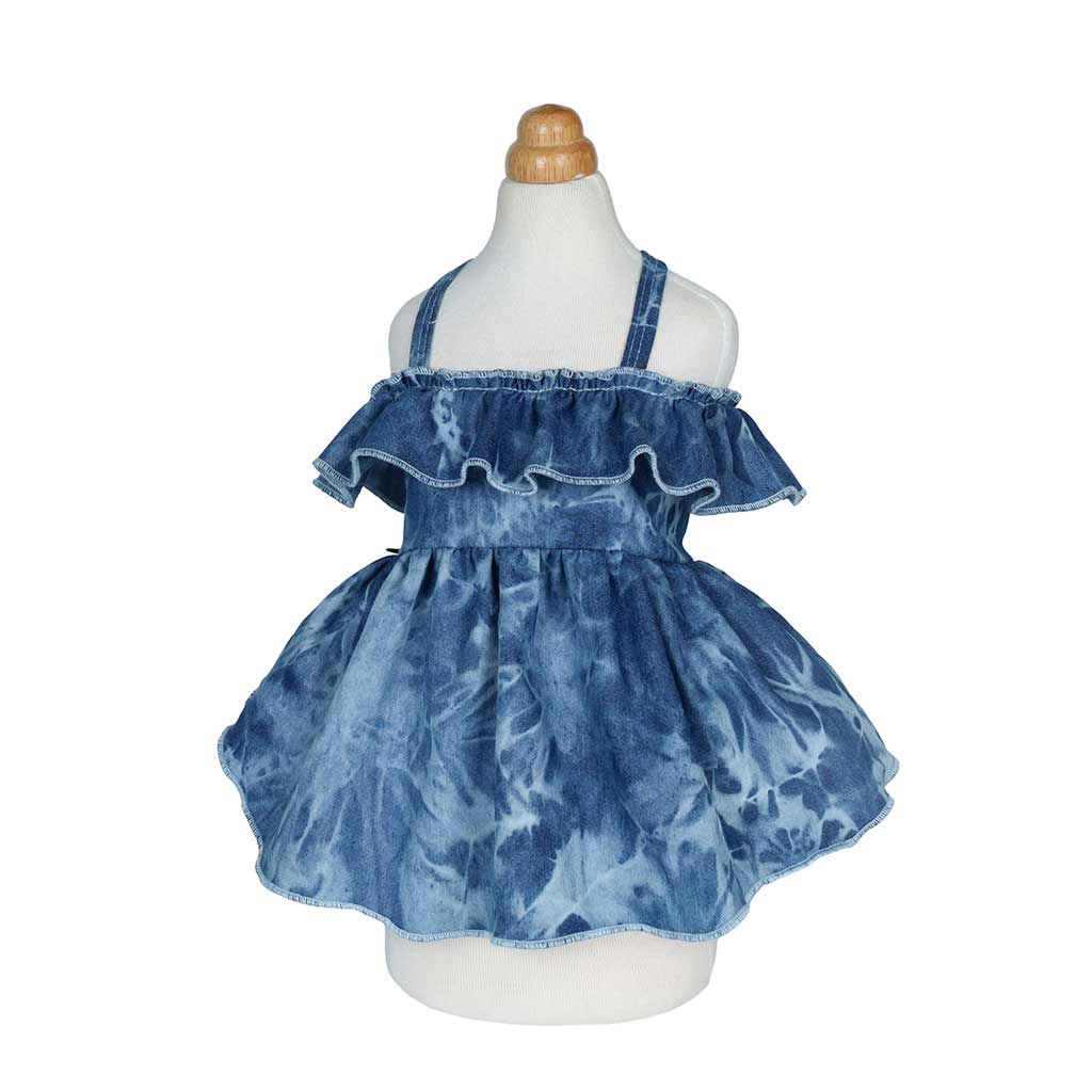 Tie Dye Denim Dog Dress with Ruffles - Back view, halter neck, princess style dog clothes
