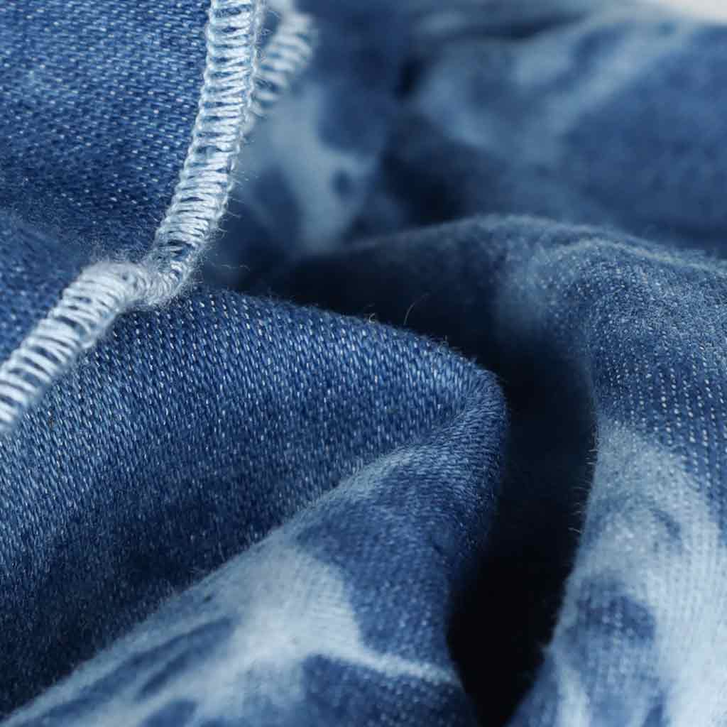 Close-up of tie dye denim fabric for dog dress, showing texture and color. Lightweight and breathable material.
