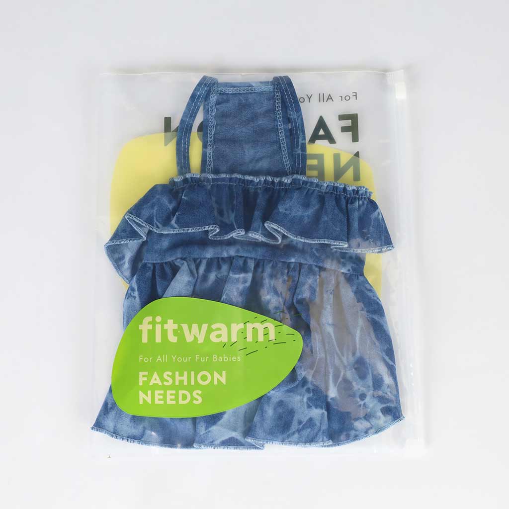 Fitwarm tie dye denim dog dress in packaging, princess style with ruffles. Fashion needs for small dogs.