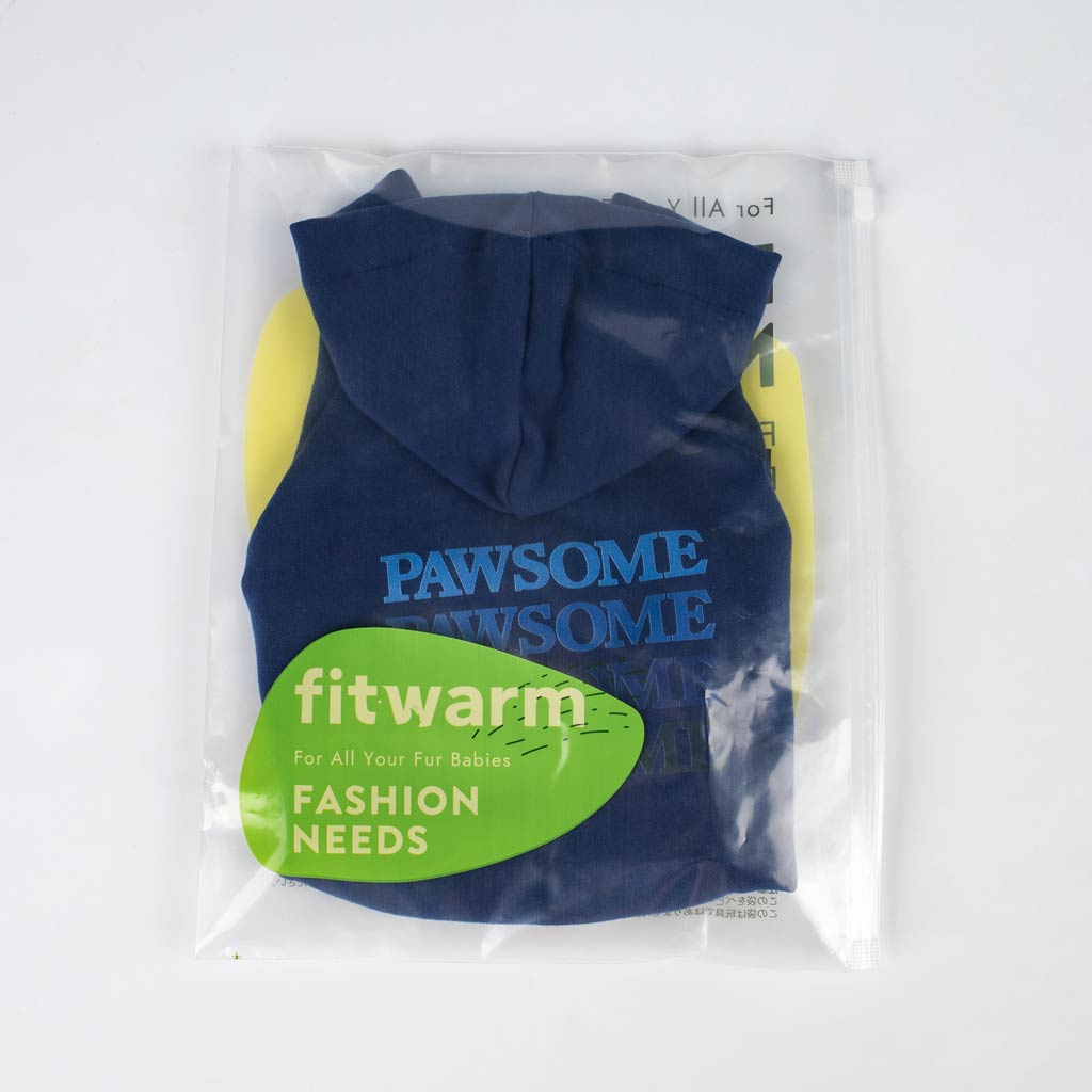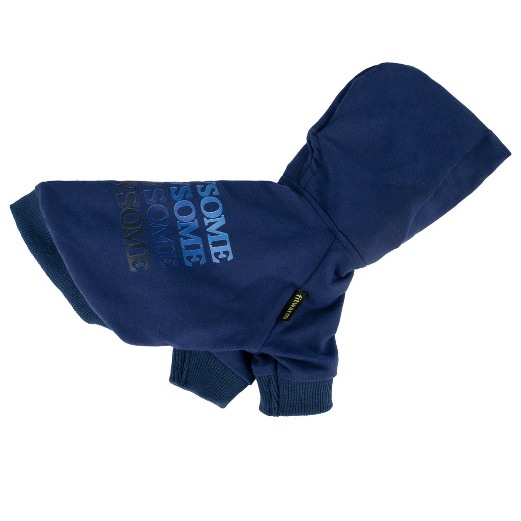 Fitwarm navy blue "Pawsome" dog hoodie in packaging, comfortable dog apparel, 95% cotton, for small dogs