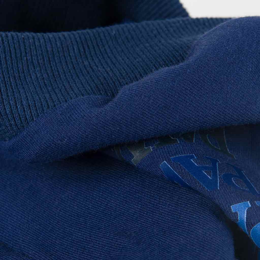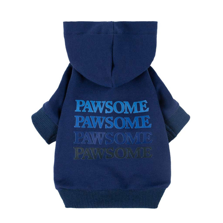 Navy blue Pawsome dog hoodie detail, "PAWSOME" lettering, comfortable cotton blend apparel