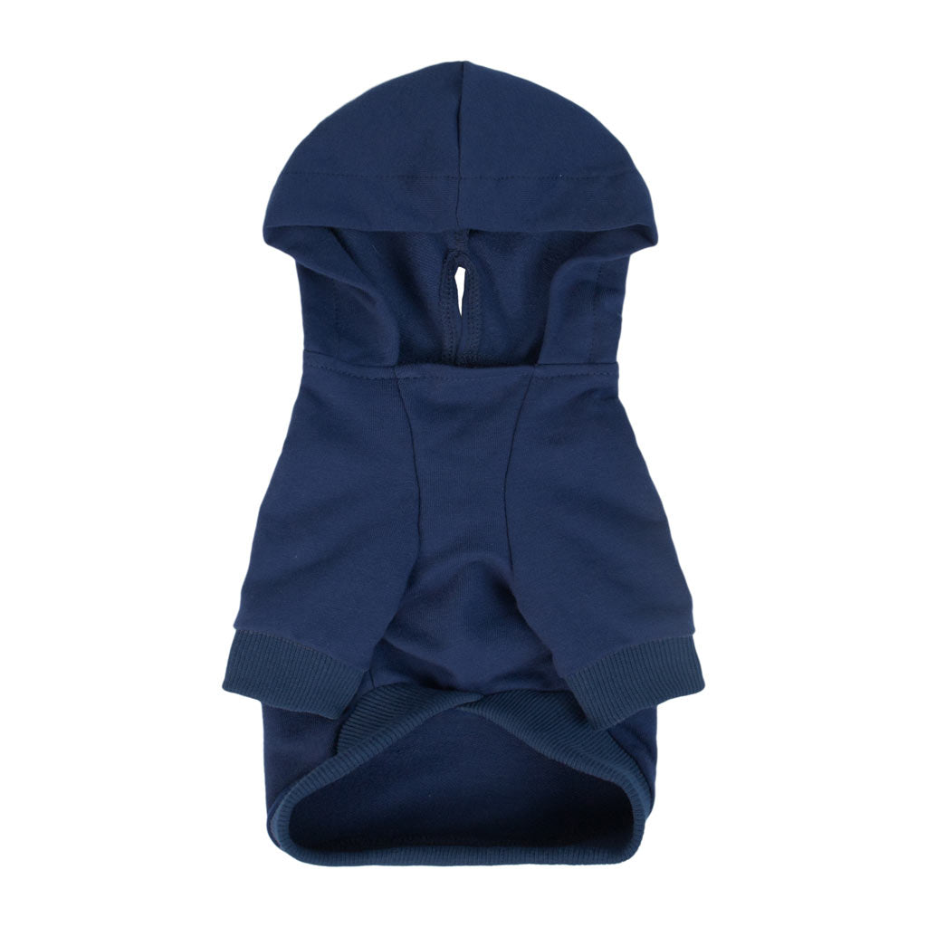 Navy blue dog hoodie back view, comfortable dog apparel, made from a cotton blend, for small dogs and cats
