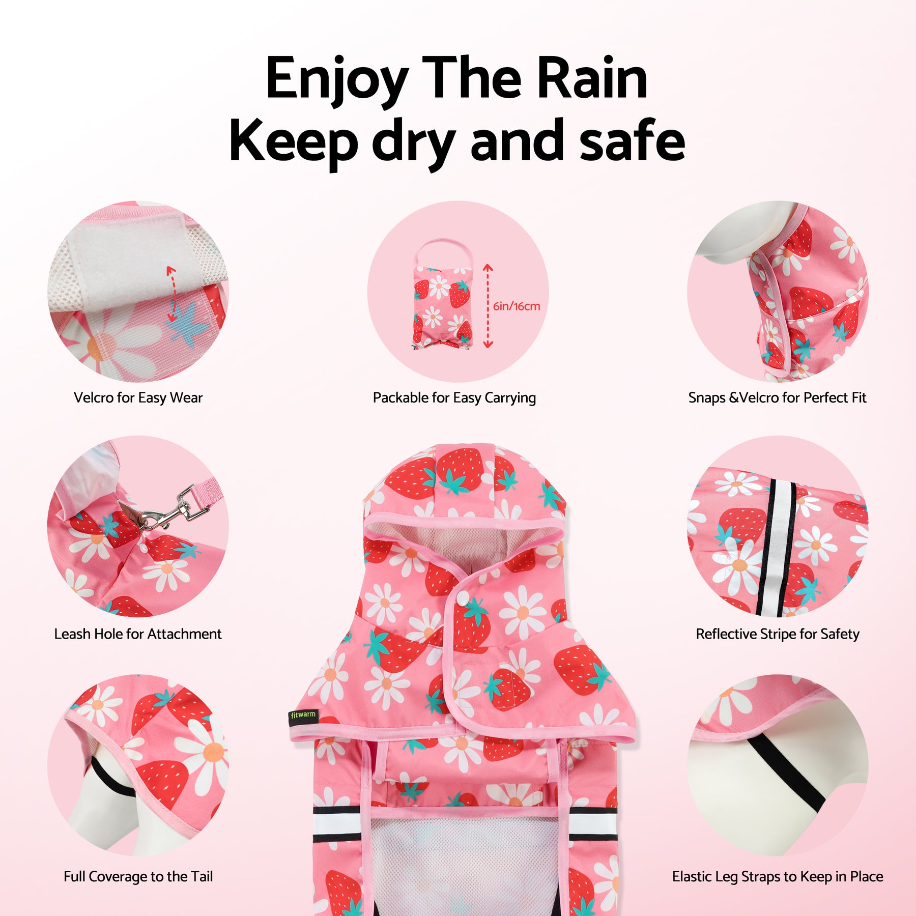 Fitwarm Strawberry Daisy dog raincoat, pink, waterproof with hood, reflective stripes, and packable design.