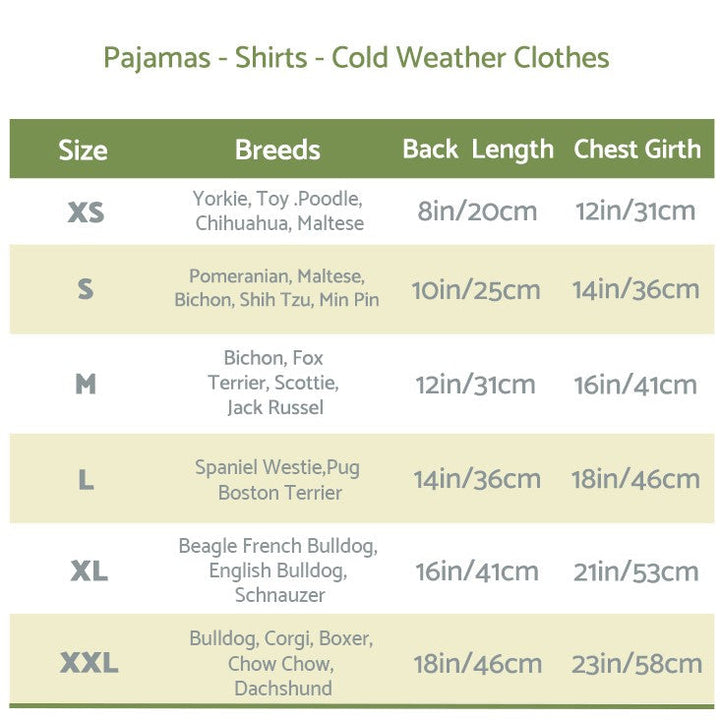 Dog Pajama Size Chart - XS to XXL - Breeds include Yorkie, Dachshund, French Bulldog, and more