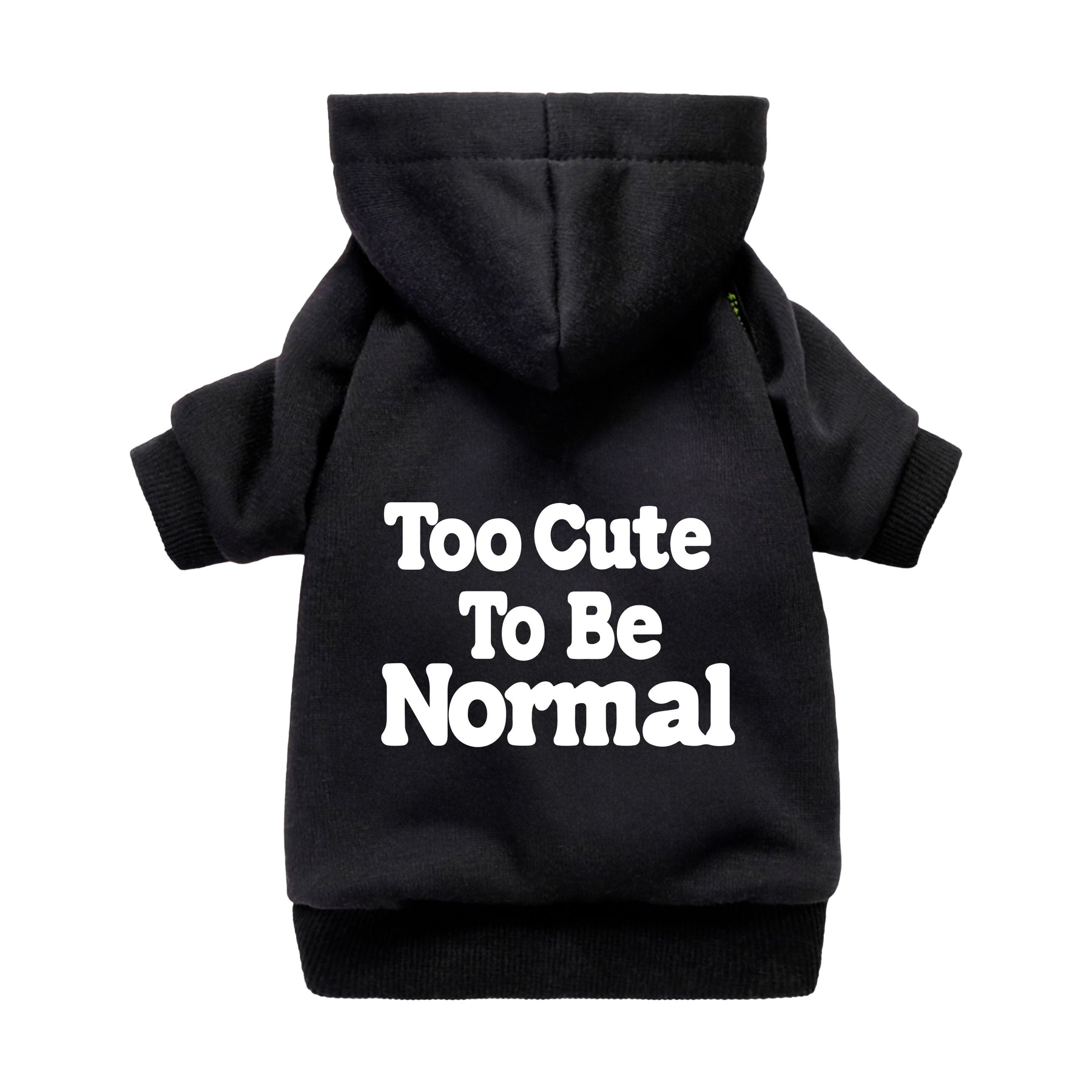 Funny dog hoodies designed in sleek black feature bold “Too Cute To Be Normal” lettering for a fun everyday style. Comfortable black dog sweatshirt with classic hooded design and ribbed trims provides secure wear and relaxed movement. Pullover structure allows easy dressing, making hoodie suitable for both indoor lounging and outdoor stroll.