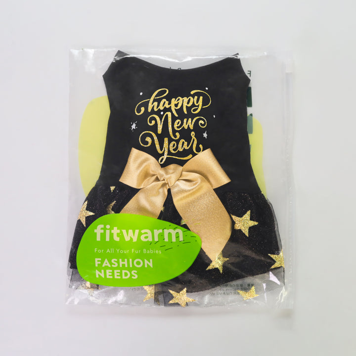 Black and gold Happy New Year dog dress featuring gold stars and a bow, perfect for small dogs and cats
