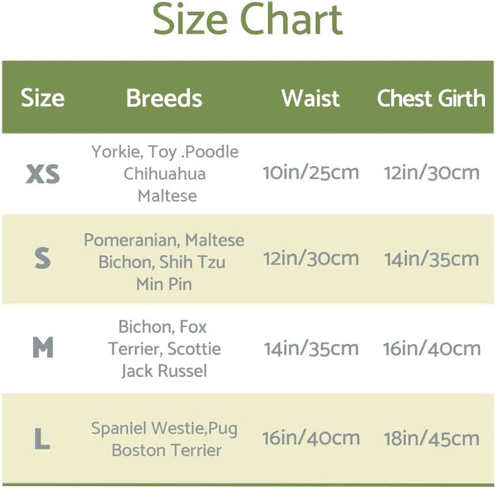 Fitwarm dog apparel size chart: XS-L with breed-specific waist/chest measurements for a perfect fit.