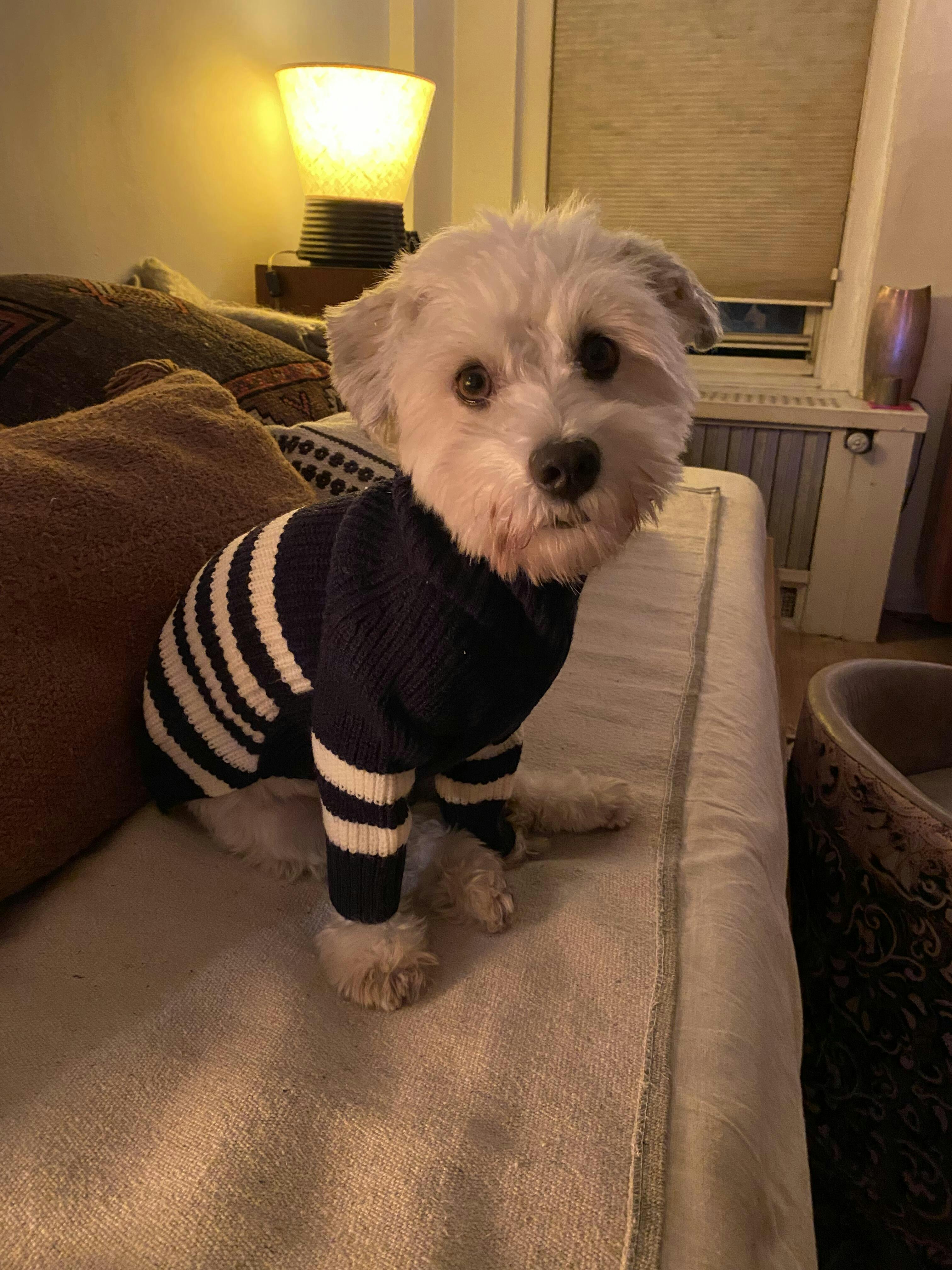Chihuahua dog in red turtleneck sweater with white stripes, perfect for winter fashion