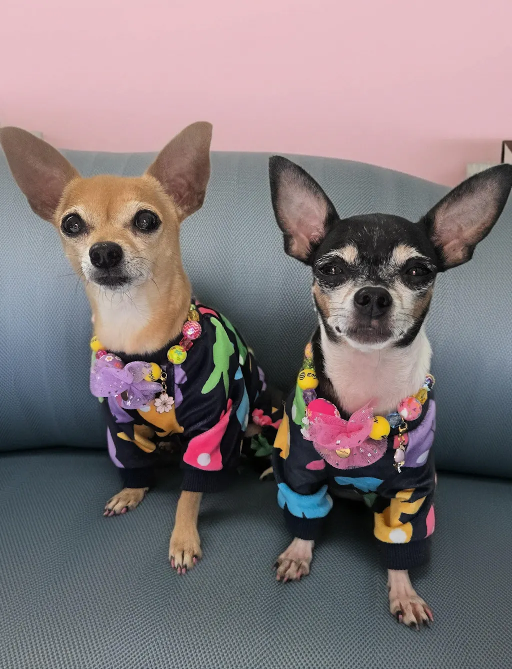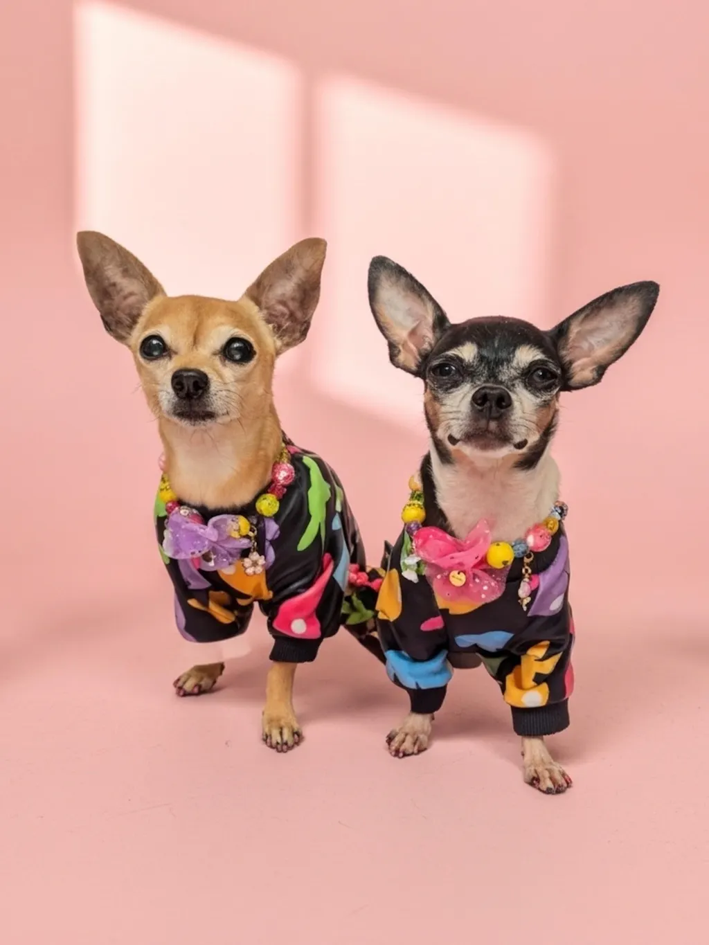 Colorful bunny dog pajamas on navy fabric with playful print and "fitwarm" tag.