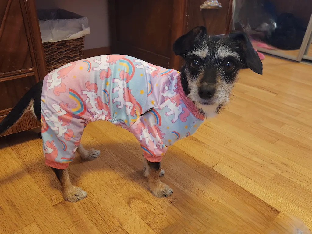 Small dog sitting in unicorn dog pjs featuring soft pastel tones and unicorn pattern