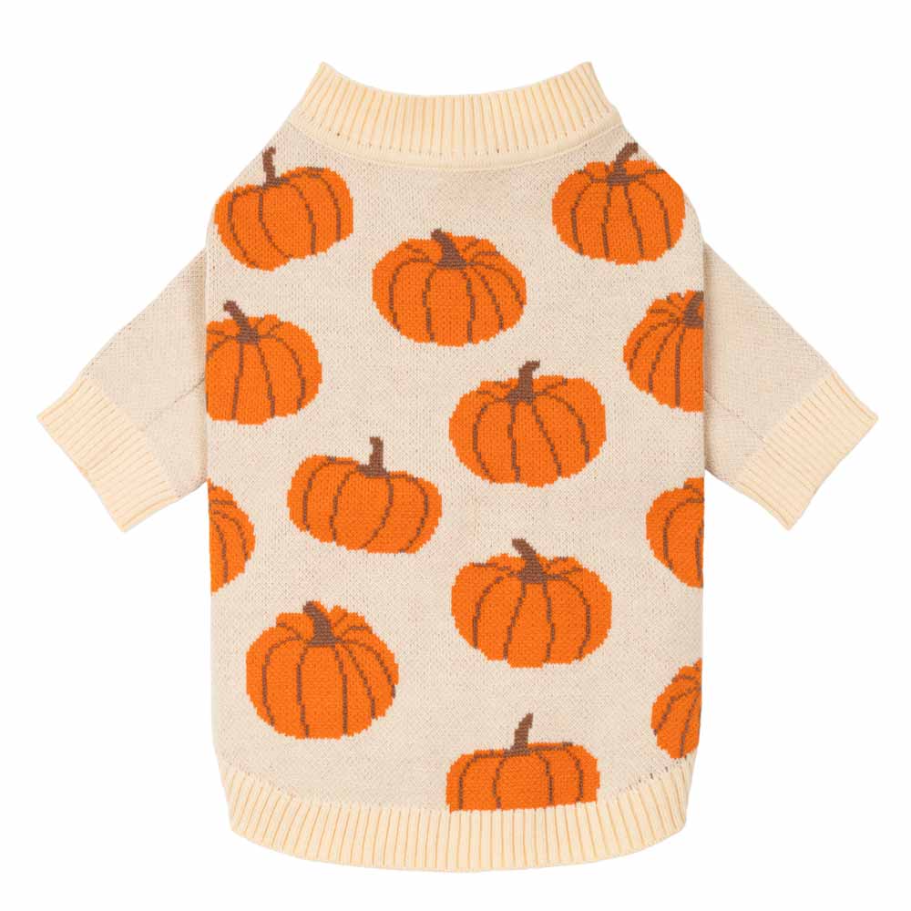 Dog wearing a cream dog sweater with allover orange pumpkin prints